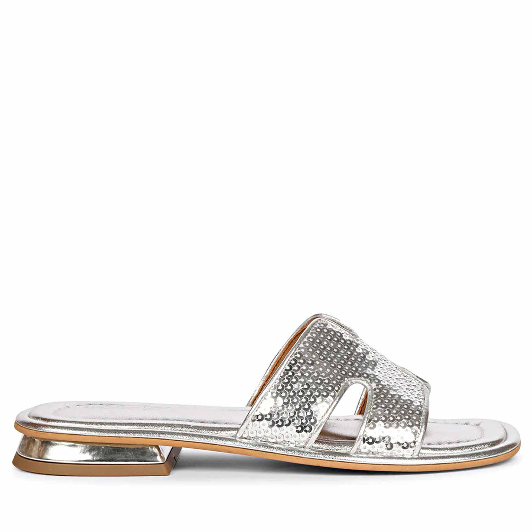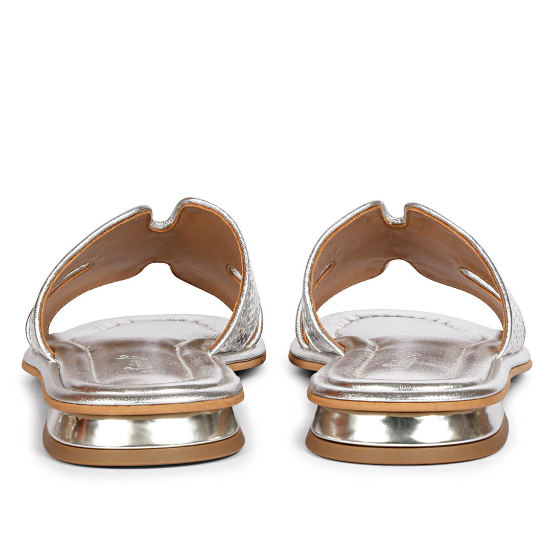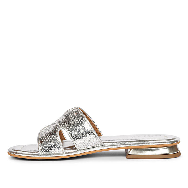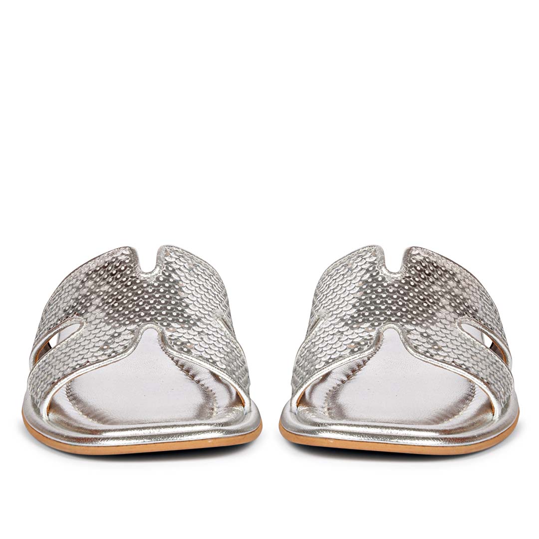 Show off your summer styling with our Radiant accessory flats. Step into paradise with our metallic silver leather slides! The sequin embellished leather and low heel add playful details. Perfect addition to any summer outfit!
