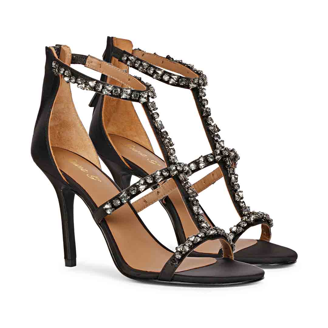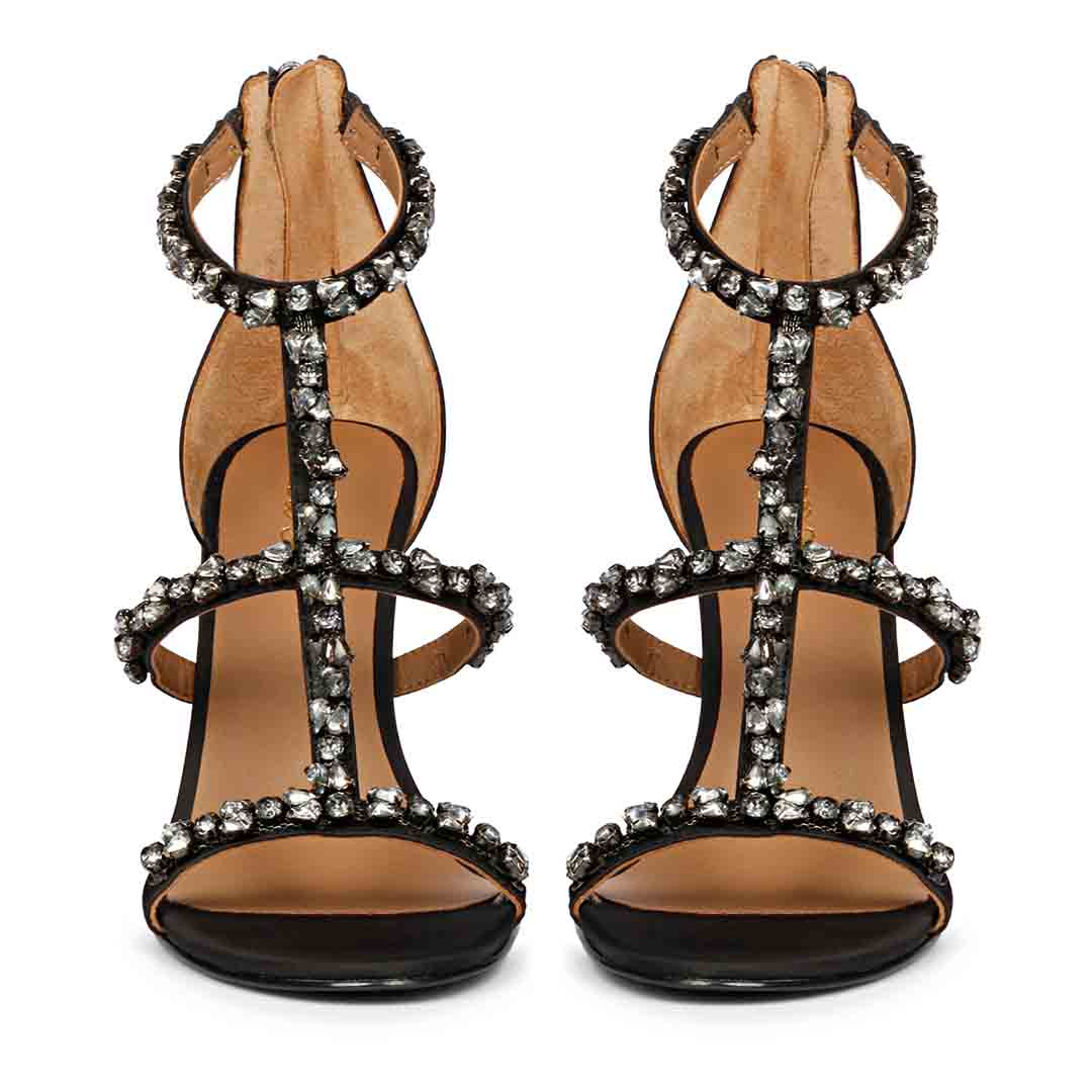 Saint Ella Silver Stone Embellished Black Leather Heels