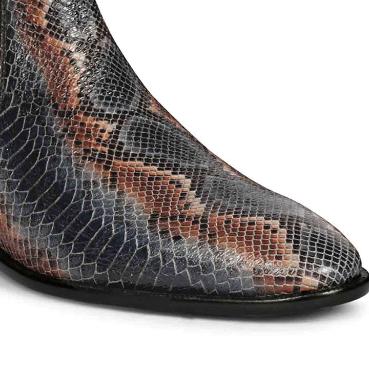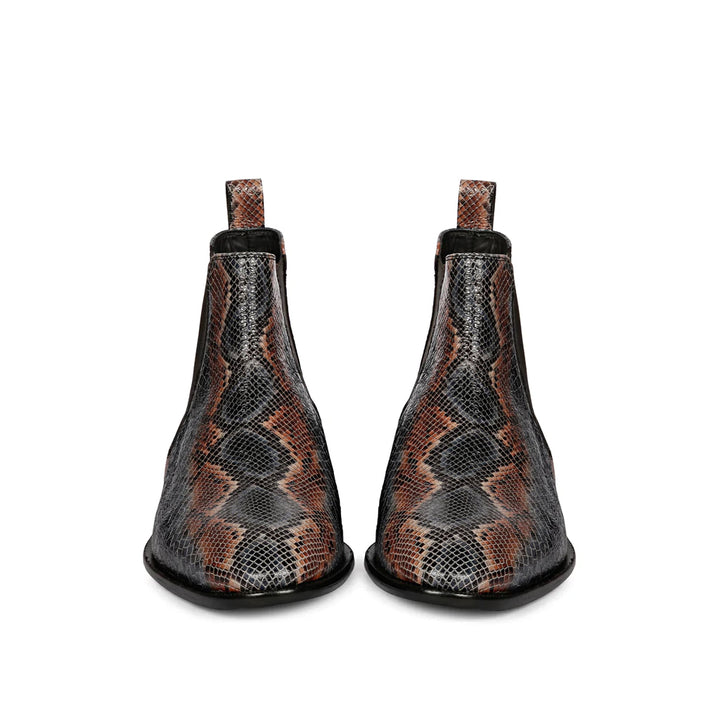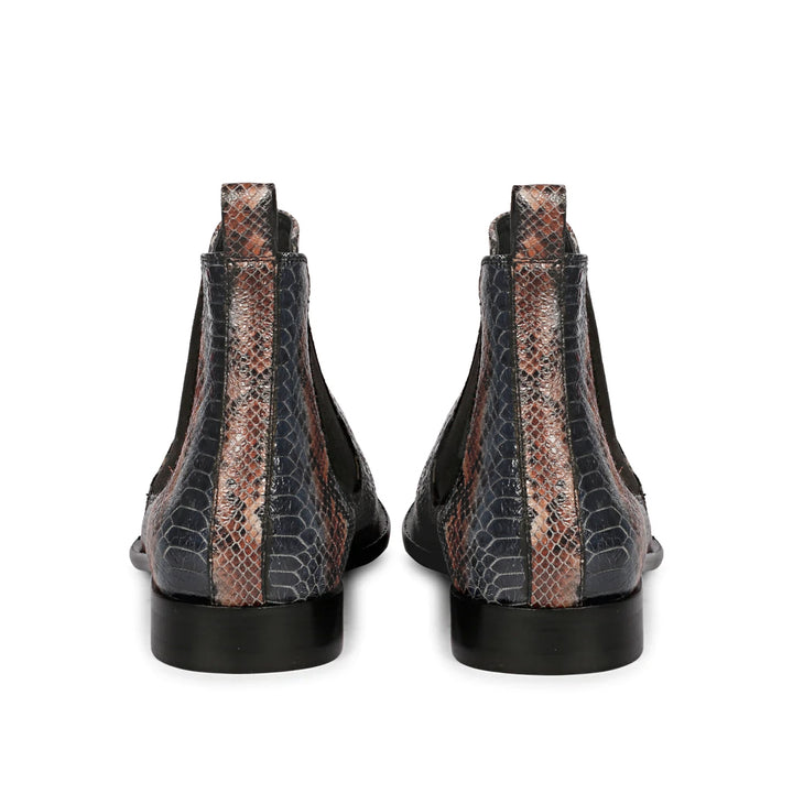 Exquisitely handcrafted, this pair of blue snake-print leather Chelsea boots from SaintG showcases distinctive texture and masterful finishing. Designed with a slip-on silhouette, it features elasticated side panels and a pull tab for ease of wear and a refined profile.
