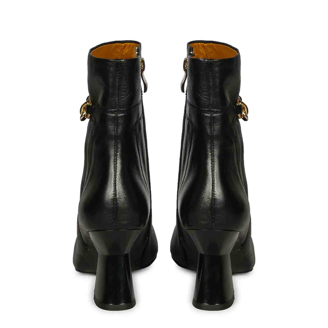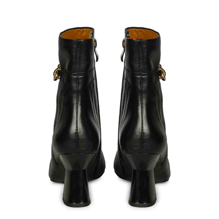 Get ready for winter fun. Walk a little taller in these beautiful Saint Madelyn black ankle boots. The side golden chain on these pointed boots is the perfect way to add a little glam to your everyday look. Featuring zip closure, a pointed toe, black leather upper, leather lining and branded leather insole. The boot sit on a sculpted heel. Pair with a cute day dress and kill it babe.