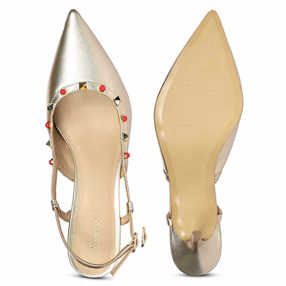 This pointed slingback turns up the charm with glossy red bead studs and gold pyramid accents dancing across the upper. The mix of bold color and metallic shine adds just the right amount of fun to a sleek silhouette.
