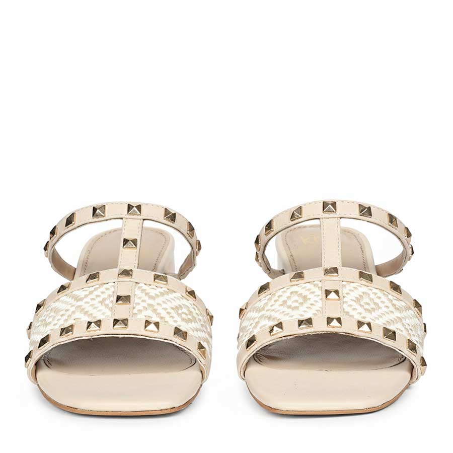 Two color toned raffia panels framed with pyramid studs bring depth and shine, while the wide straps give the pair a balanced and confident look. The low block heel keeps the silhouette grounded and easy to style for everyday wear.