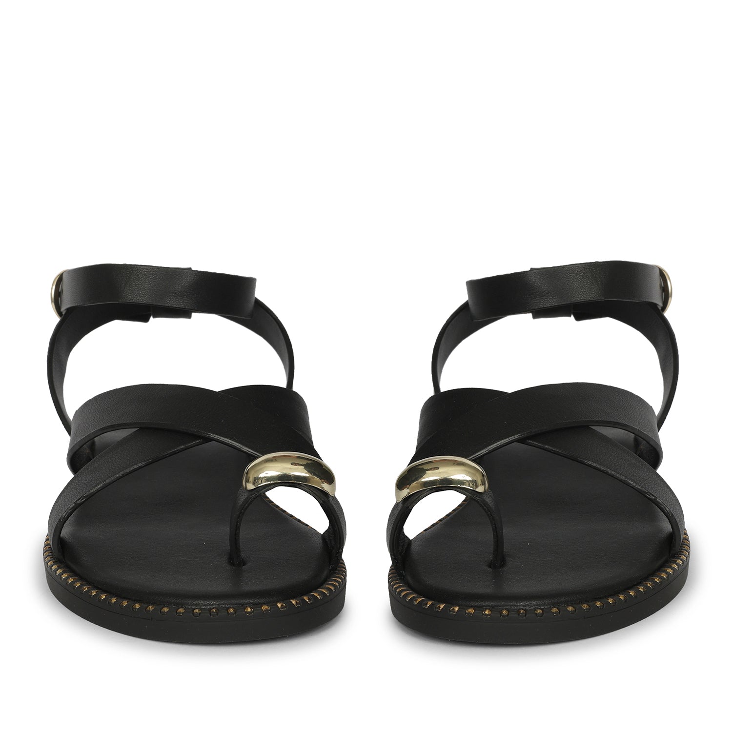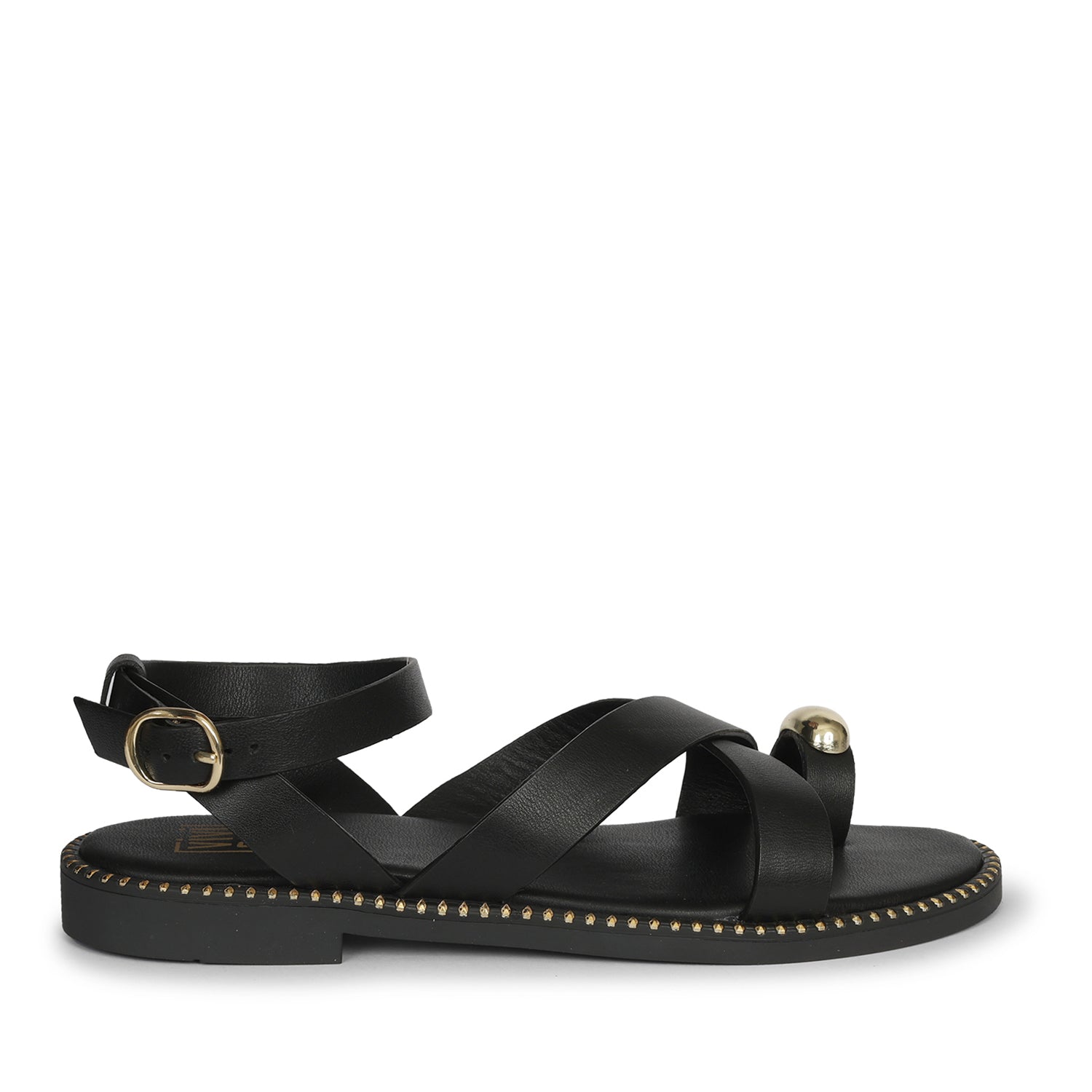 Reyna Black Leather Flat Sandals