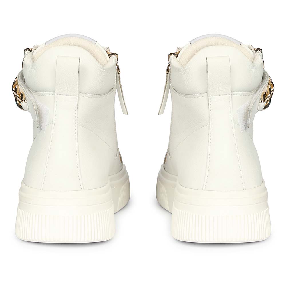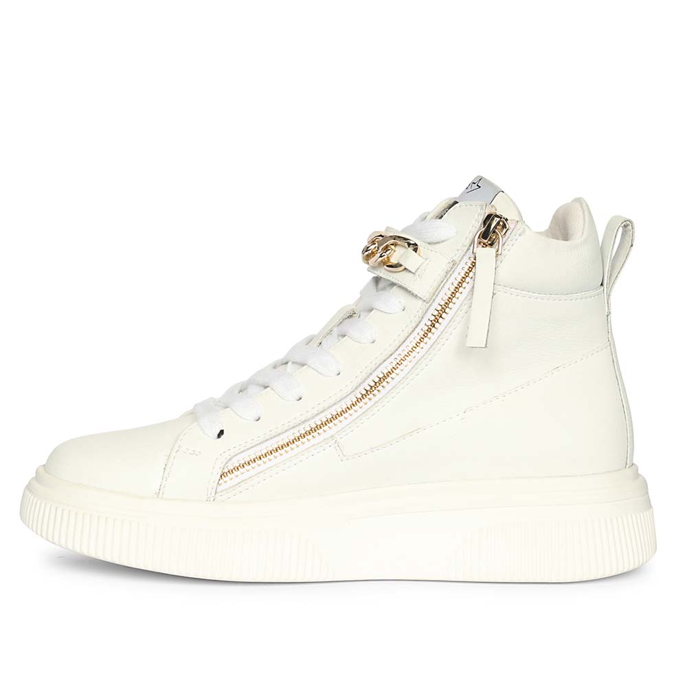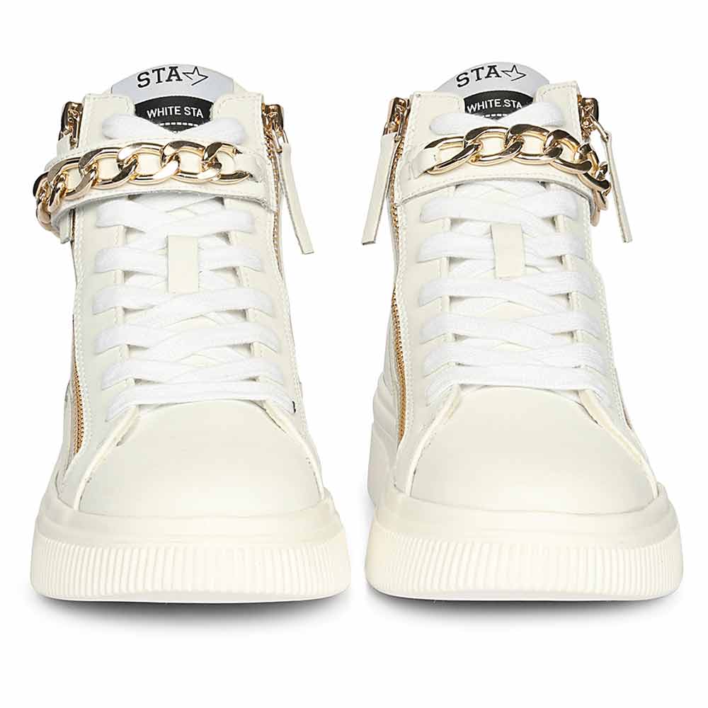 Laces & Trims: Gold cross chain, Metal Zip, Blind eyelets.
