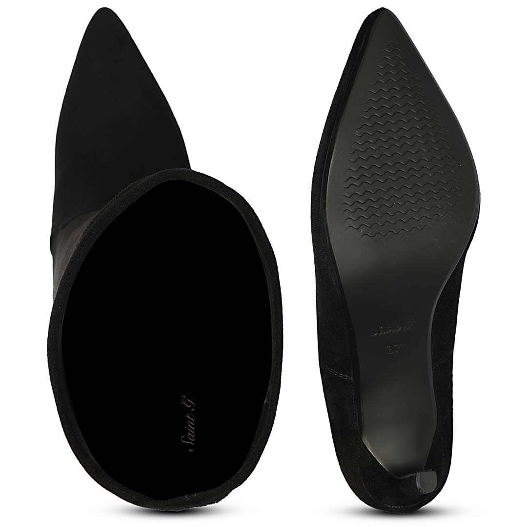 The Saint Jemima black stretch suede knee high boot is a luxury that cleverly combines a stylish youthful outlook. These knee high boots have a black stretch suede upper and a pointed toe to add a touch of style to your everyday look. Made from the finest materials and finished with trending design details. Features a covered stiletto heel, stitching details with paneled finish. complete with leather lining, padded leather footbed with stamped logo and tunit sole.
