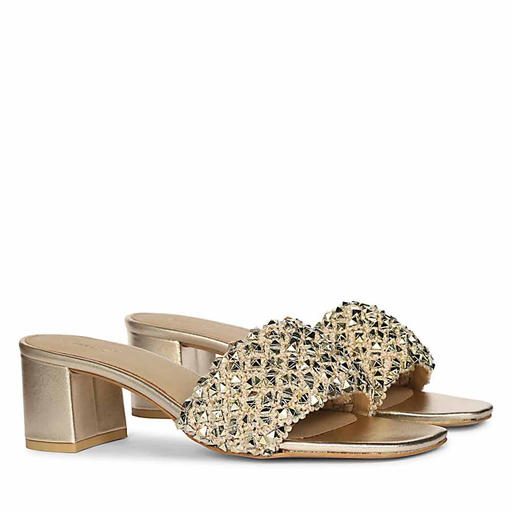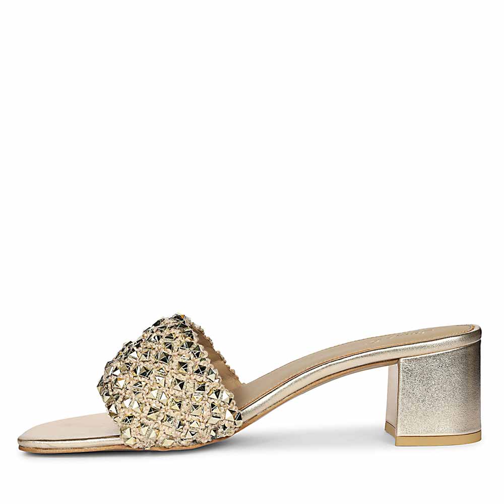 Meet Winnie, a heel designed to shine with every step. Featuring a stunning metallic gold and beige embellished upper, this pair sparkles with intricate geometric stud that catch the light beautifully. The sleek block heel adds both elegance and comfort, making it perfect for celebrations, special evenings, and festive moments.
