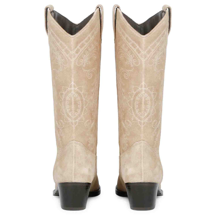 Saint Elodie, a ivory calf length cowboy boot with full stitched leather upper with both side leather pull tabs and leather sole. One of the most prominent patterns on this season.