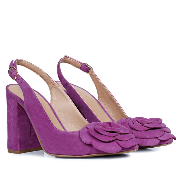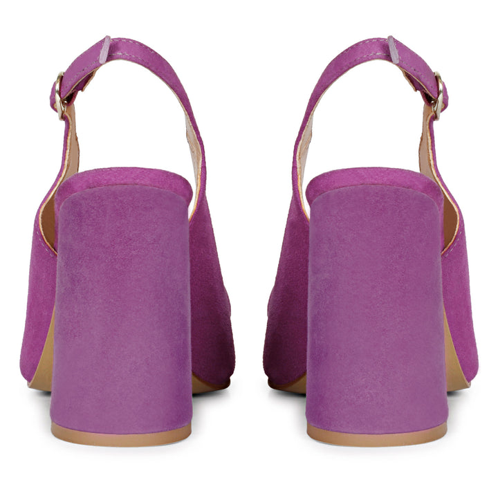 Redefine your fashion statement with our neat and elegant pairs to match your vibe this summer. These statement heels are crafted in purple suede Leather, a high platform heel to complement your classic evening looks, finished with a gold buckle fastening on the slingback, a leather covered block heel completes the style.