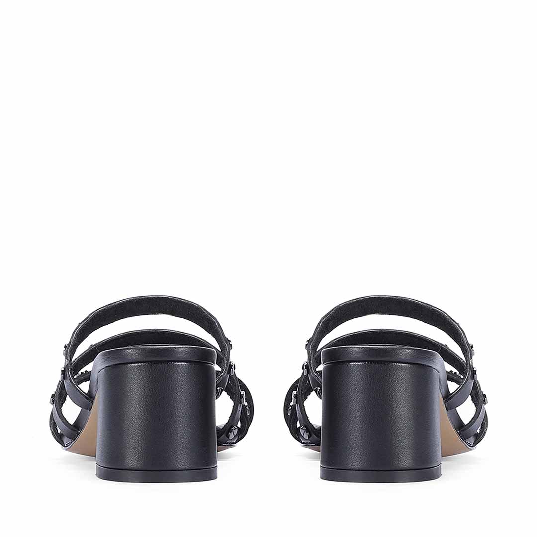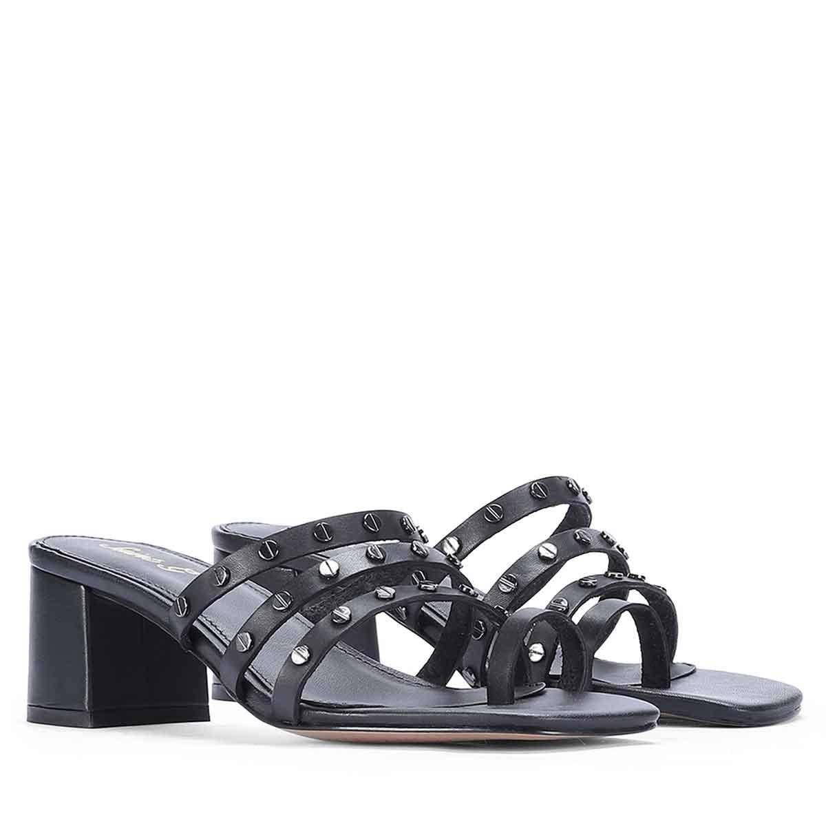 Command attention with the Ebon Luxe Studded Leather Hees, a statement in modern glamour. Handcrafted in premium black leather, the design features architectural block heels and sculptural straps embellished with polished metal rivets. The fusion of sharp detailing and timeless silhouette creates a bold yet refined aesthetic, perfect for pairing with tailored eveningwear or elevated day ensembles.