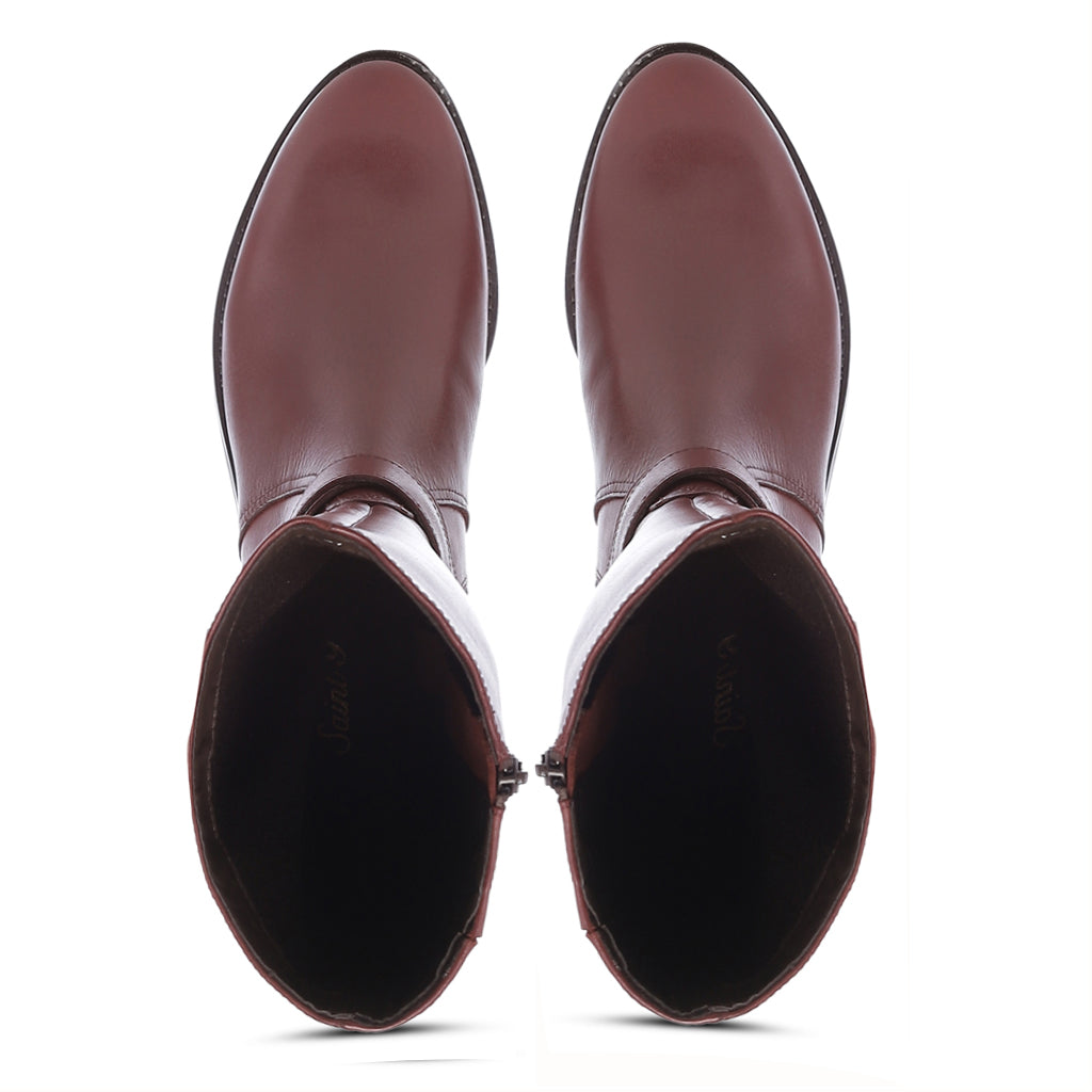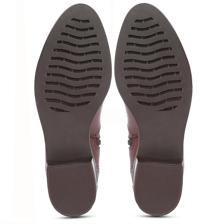 Pair our SaintG Boot with midi-skirts, flared pants or long dresses. Made in teak crust leather, these knee high long boots are a winter sweetheart. An easy-to-close zip and silver buckles adds comfort and look to its style quotient. These knee high boots will keep you warm and on-trend. These will be love at first sight when you put these boots on.
