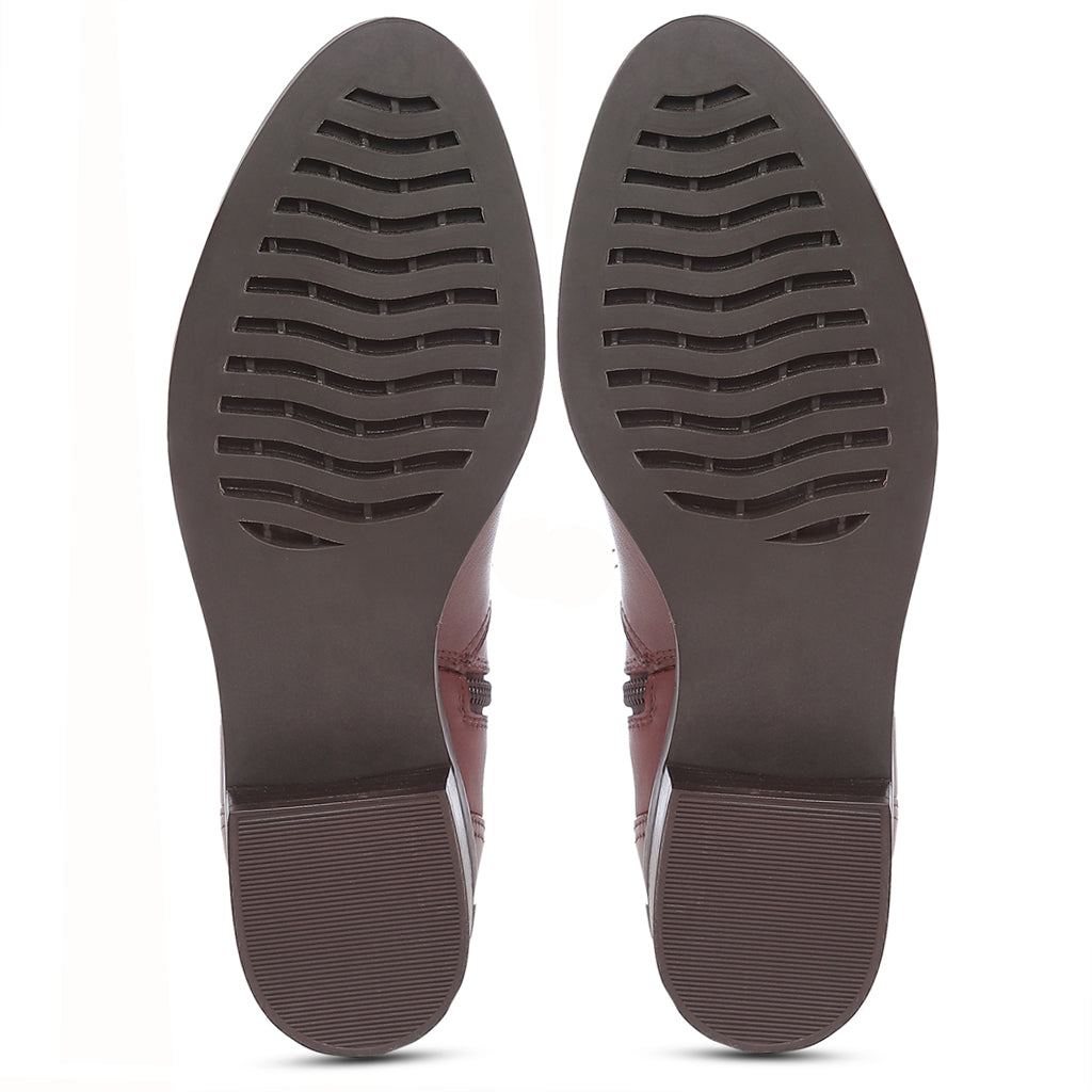 Beautifully made, these teak knee high long boots are crafted from 100% genuine leather showcasing with gold toned buckled wrap strap at ankle, fleece and leather lined for a luxurious feel, padded leather footbed provides lasting comfort. has a rounded toe, an inside zip closure to ensure comfortably slip them on and off. These great-looking strappy boots feature a classic western style that can take you from a day in the office to a casual date or night out with friends. These premium quality leather boots are constructed using an anti skid handmade tunit sole which ensures that you do not accidentally fall on any surface. Fitted on a low block heel.