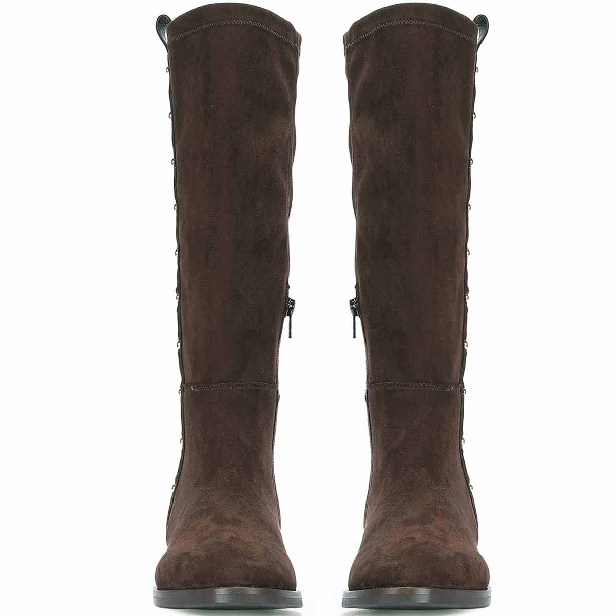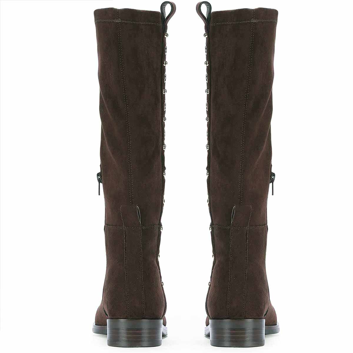Dark, refined, and quietly subversive: the Marlowe boots wrap the leg in soft stretch suede, elevated by a bold line of metallic eyelet studs running down the shaft. Their silhouette is grounded by a low block heel and finished with a discreet side zip and pull tab for ease. They merge everyday wearability with an unmistakably fashion-forward edge. A boot designed not just to walk but to make an entrance.