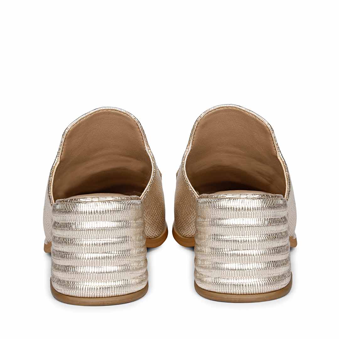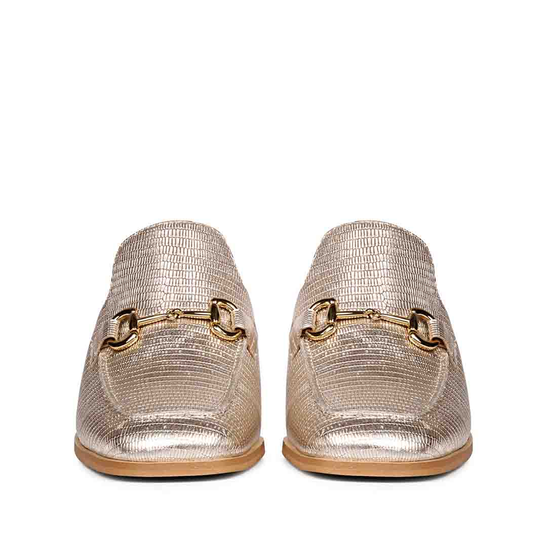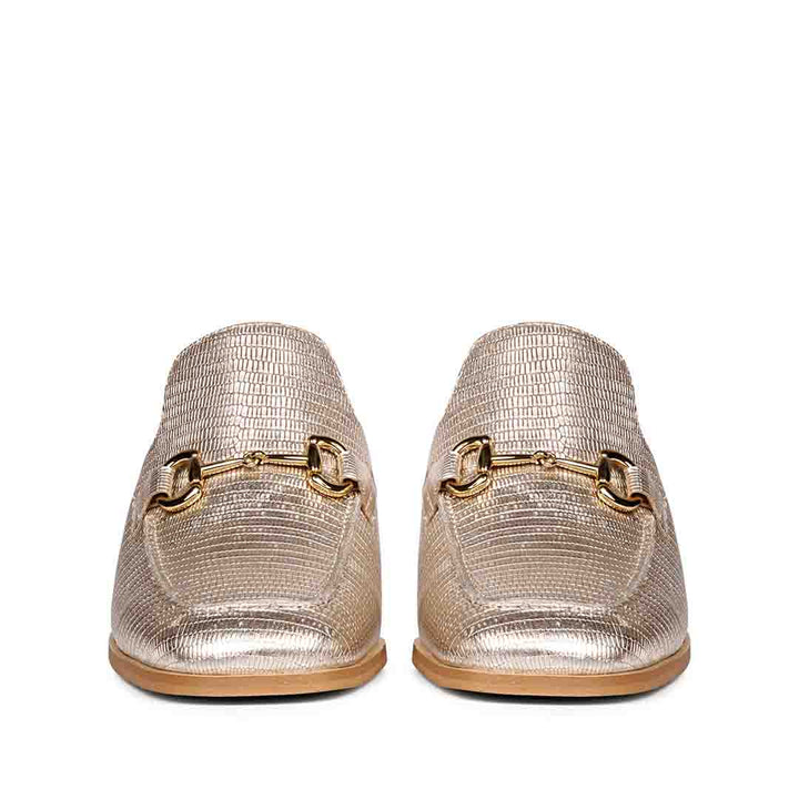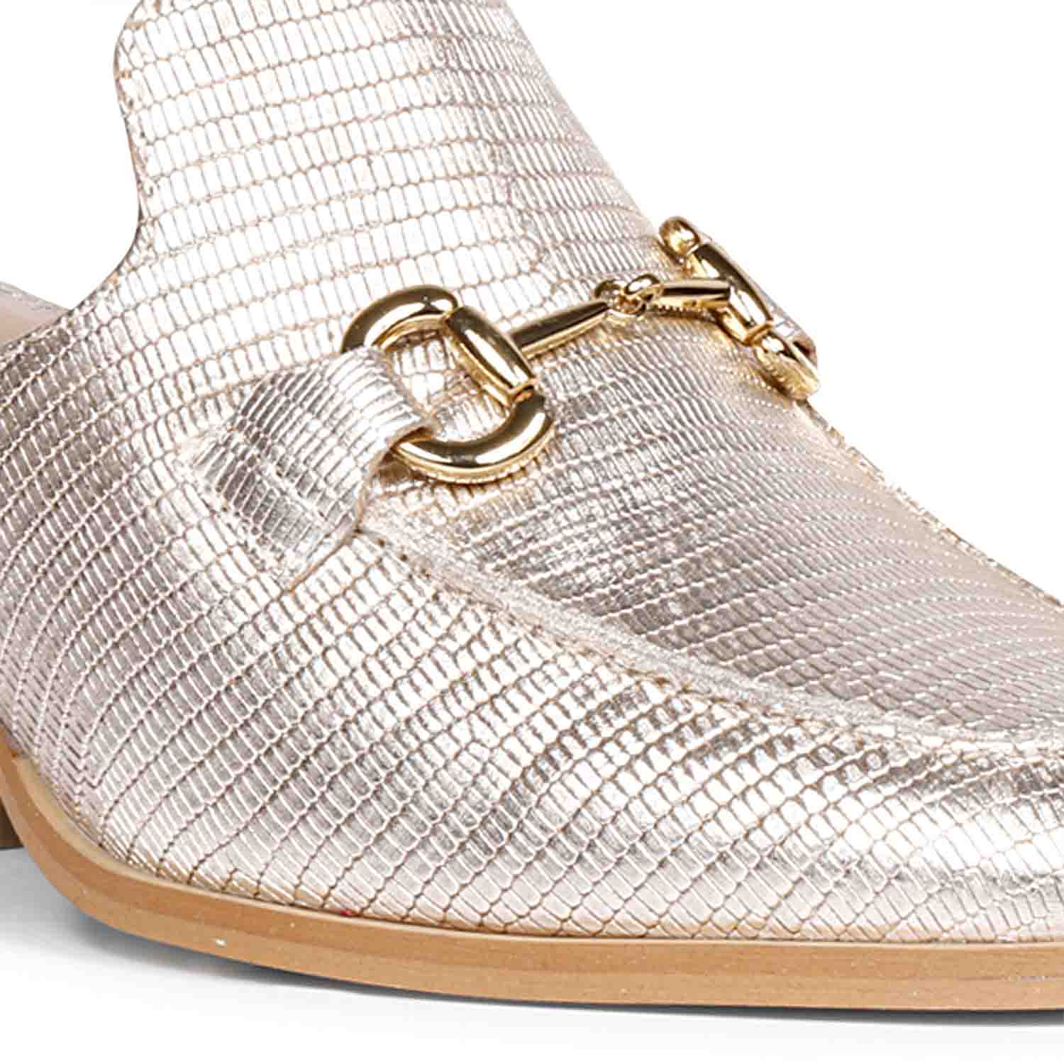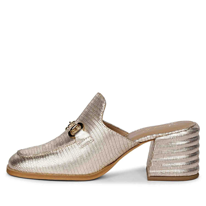 This Jasmine mule is crafted from gold lizard print leather, a decorative leather covered mid block heel, embellished with a gold tone horsebit hardware on the vamp and a slip-on design. complete with nude leather lining, a breathable padded leather insole and black tunit ribbed sole.