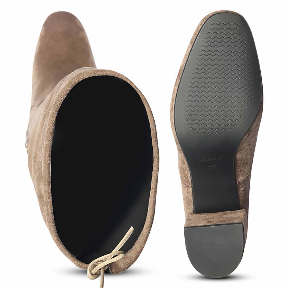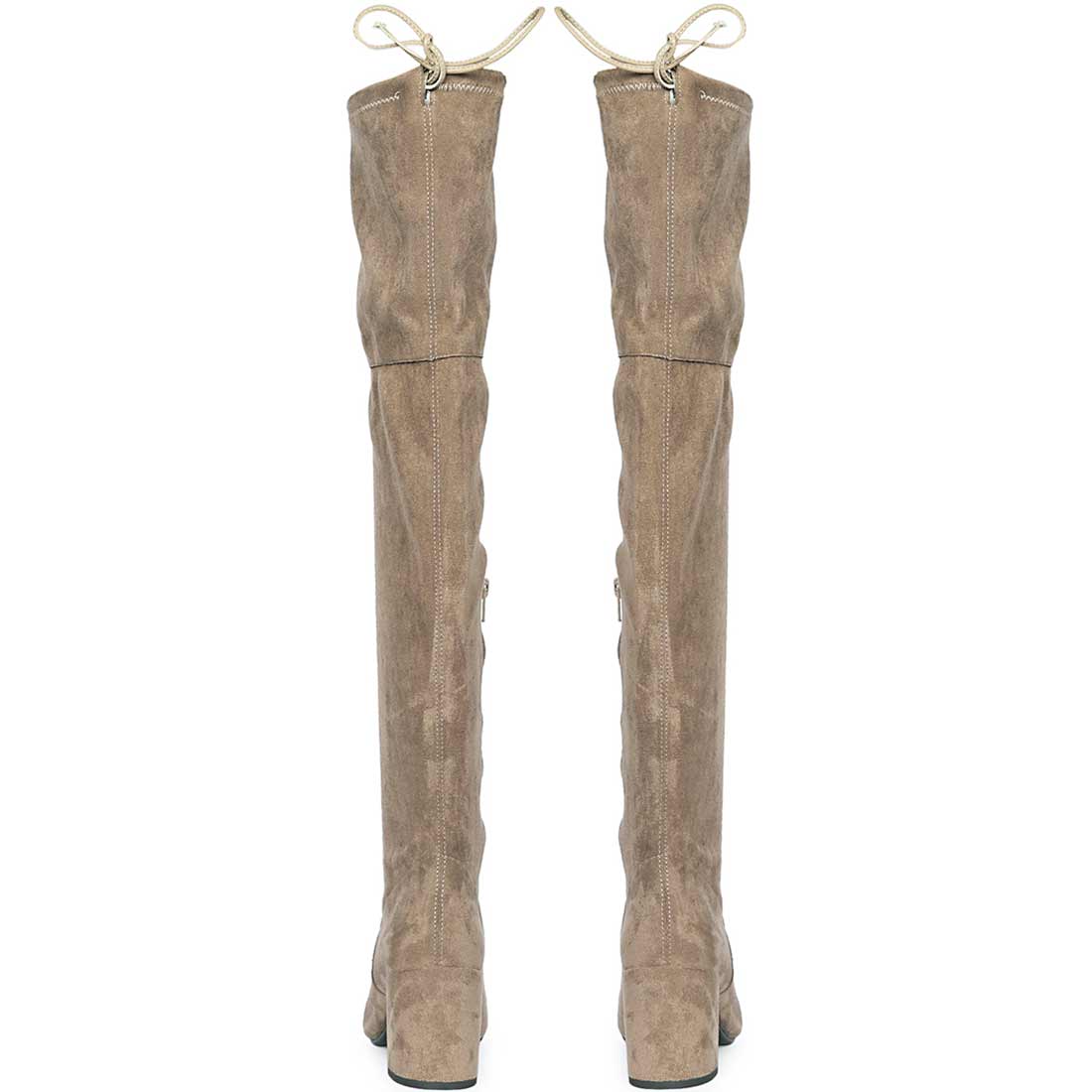 The Saint Luisa taupe stretch suede boot is a luxe boot that cleverly combines a stylish youthful outlook. These above the knee boots have a taupe stretch suede upper and inside zipper to add a touch of style to your everyday look. Made from the finest materials and finished with trending design details. Features a covered block heel, an over-the-knee shaft with drawstring leather tie at top, stitching details with paneled finish. complete with leather insole, leather lining and tunit sole. The approx. height of the boot is-24.8 Inches.