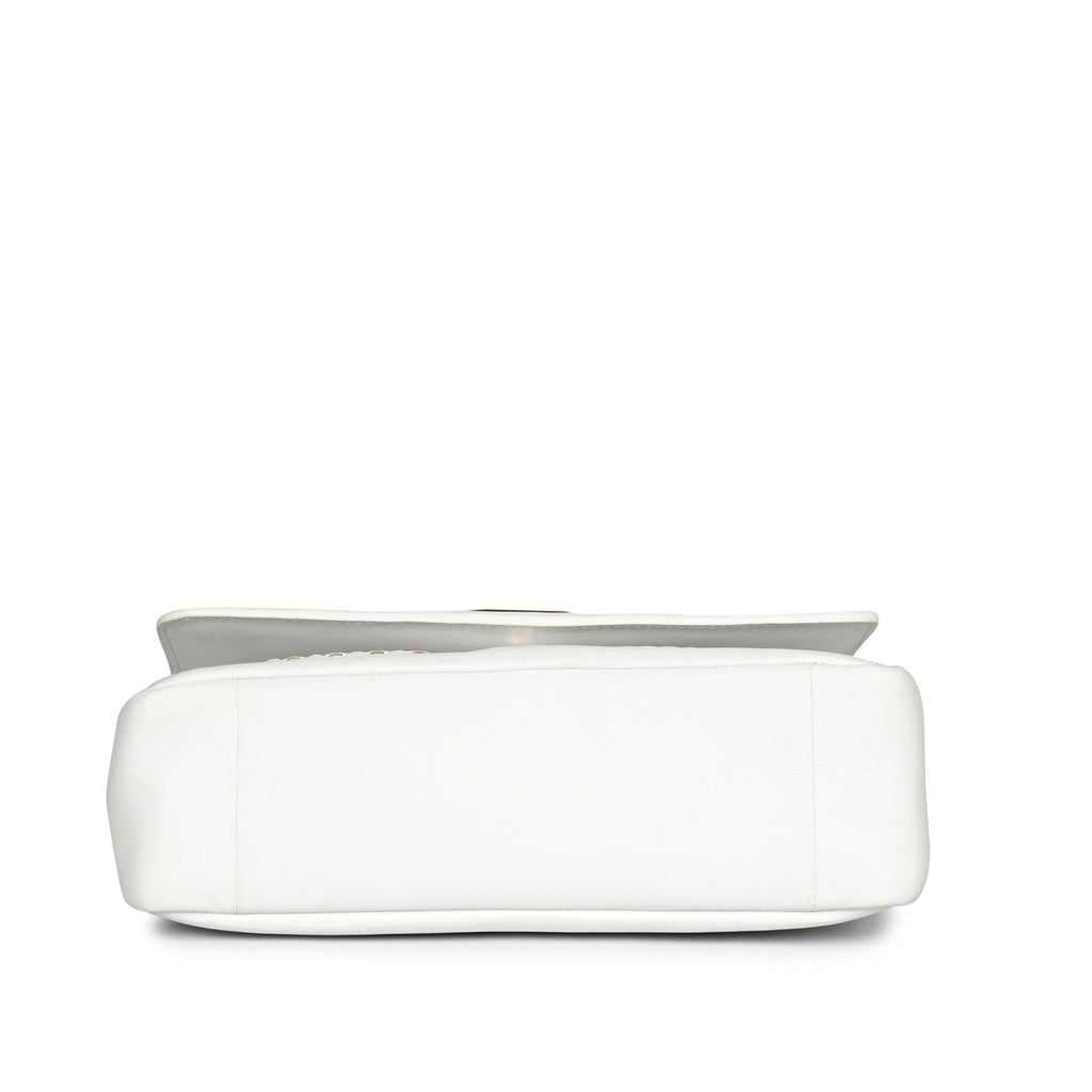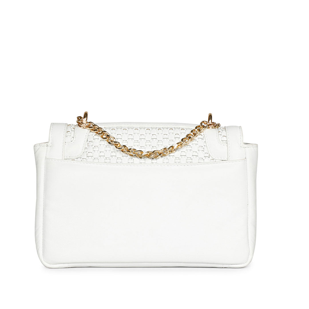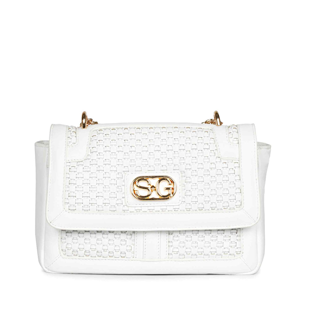 Catch All Eyes, an accessory that deserves a night out on the town, the Addie white leather sling bag is an ultra luxe bag featuring an incredible weave detail, a detachable gold toned metal chain sling strap. Has a magnetic button closure. this sling bag from SaintG adds dimension to all of your looks,