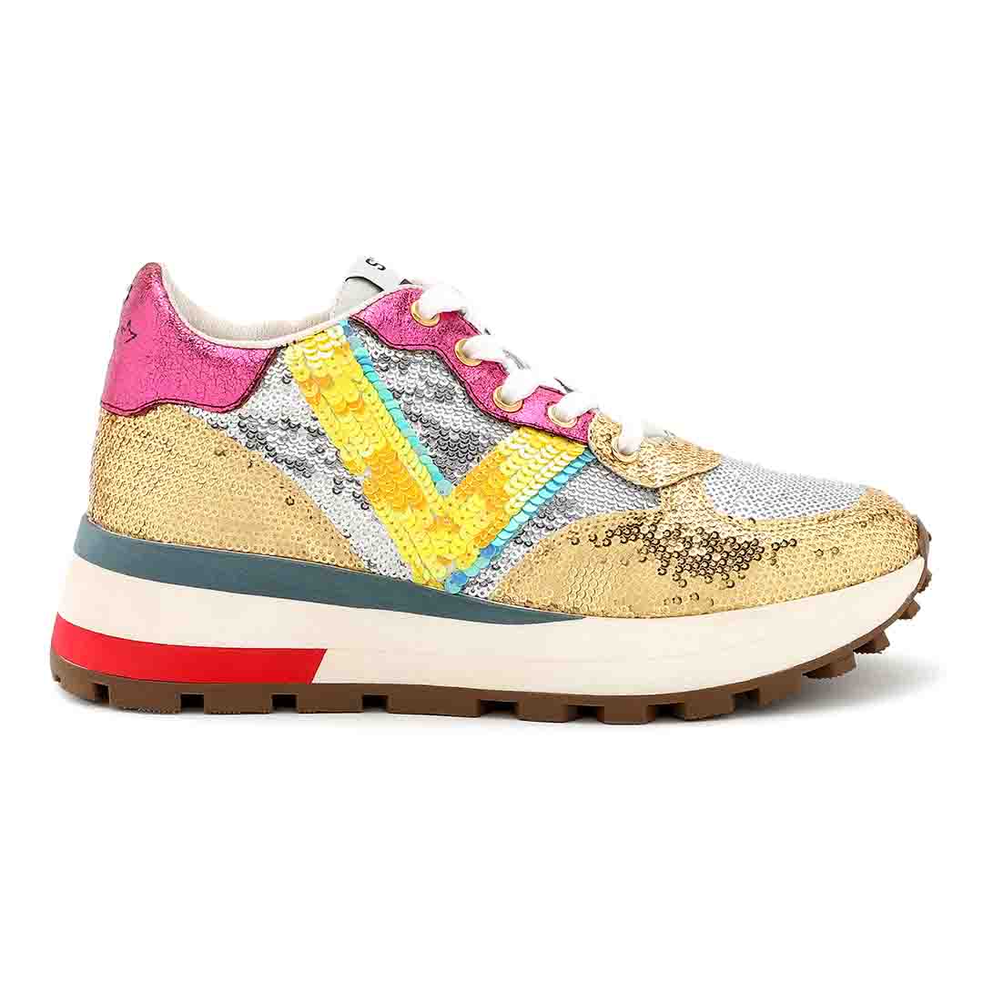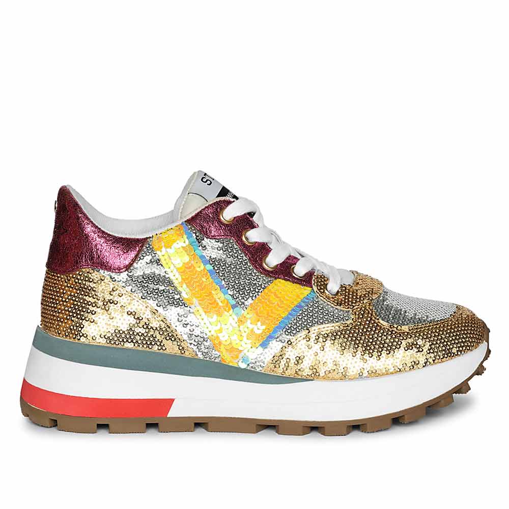 Material: Sequence Gold Fabric, Fuxia Metallic PU, Sequence Yellow Fabric