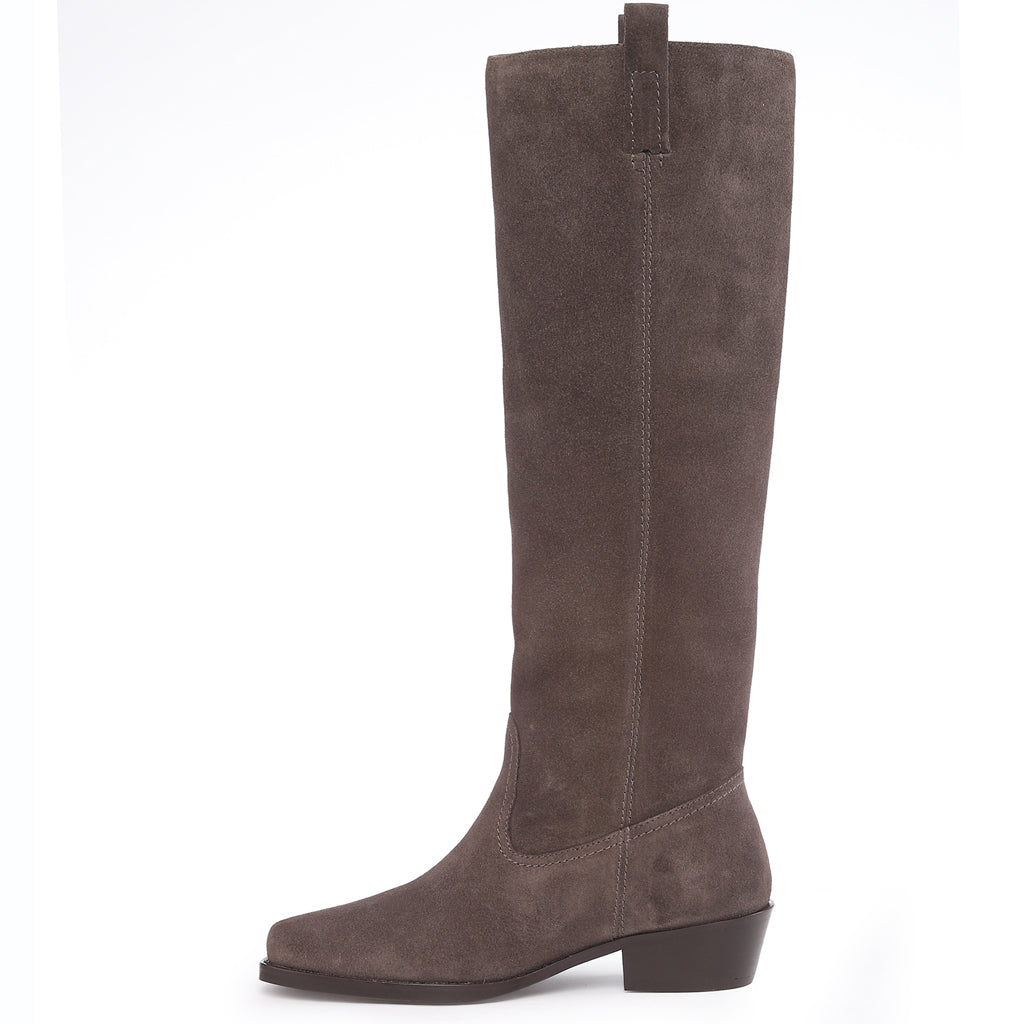 These Saint Amabel top-notch brown suede leather long boots by SaintG will keep you looking stylish, features stitching details with paneled finish, a square toe and leather loop both side on top. complete with fleece lining for a luxurious feel, padded leather footbed provides lasting comfort. The slip on closure boot sit on a slip-resistant brown TPR sole provides superior grip on various surfaces. A low heel makes this boot a stylish choice for any occasion. Nailing and stitching detail on sole.