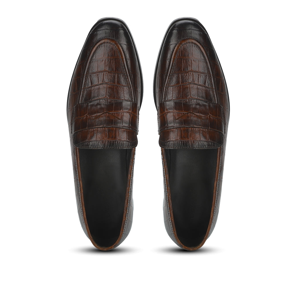 A pair of handcrafted brown croc embossed leather moccasin from SaintG. Featuring a saddle strap across the front, leather lining, leather insole and two color toned hand finished leather sole, nailing on heel.
