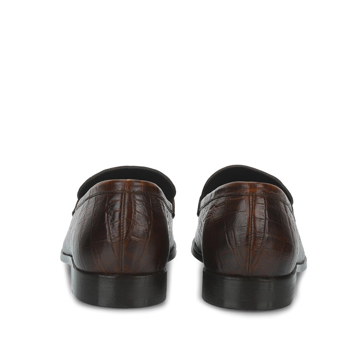 A pair of handcrafted brown croc embossed leather moccasin from SaintG. Featuring a saddle strap across the front, leather lining, leather insole and two color toned hand finished leather sole, nailing on heel.
