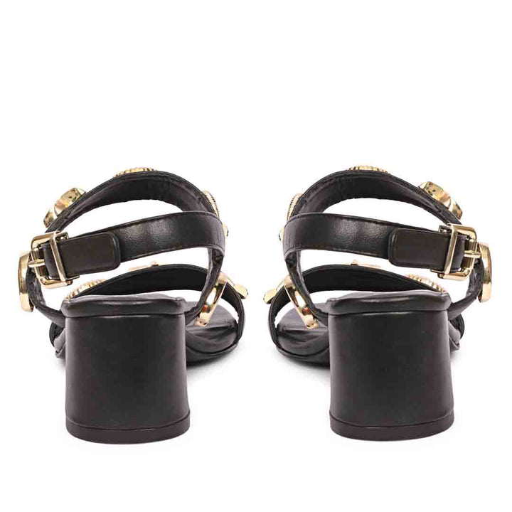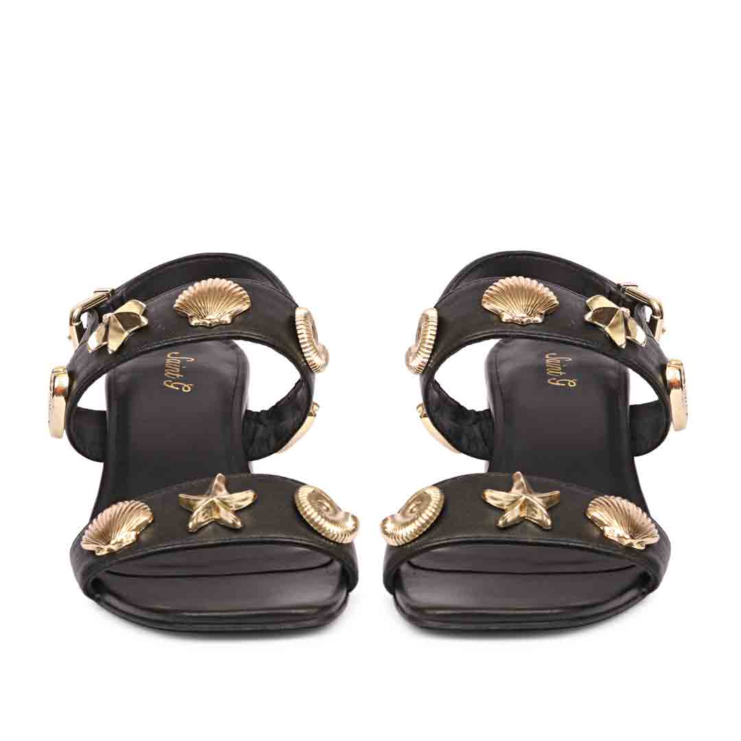 Get ready to shine with Saint Assisi Gold Seashell & Star Studs Leather Block Heels. These stunning black genuine leather heels feature eye-catching gold seashell and star studs, adding a touch of elegance to any outfit. Stand out from the crowd and add a touch of chic to your outfit with these unique statement heels.