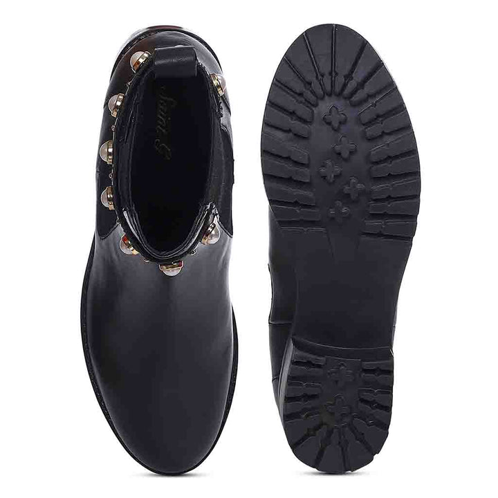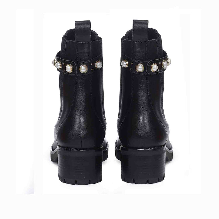 The Saint Bennet chelsea boot with an imitation-pearl–studded band, a timeless leather handcrafted shoe that'll definitely add some class to your outfits. This shoe features a premium leather upper, They're punctuated with glossy faux pearls and metal studs. Complete with breathable leather lining, a breathable padded leather insole. The solid shape and cleated rubber soles will toughen up everything from floral minis to slinky slip dresses.