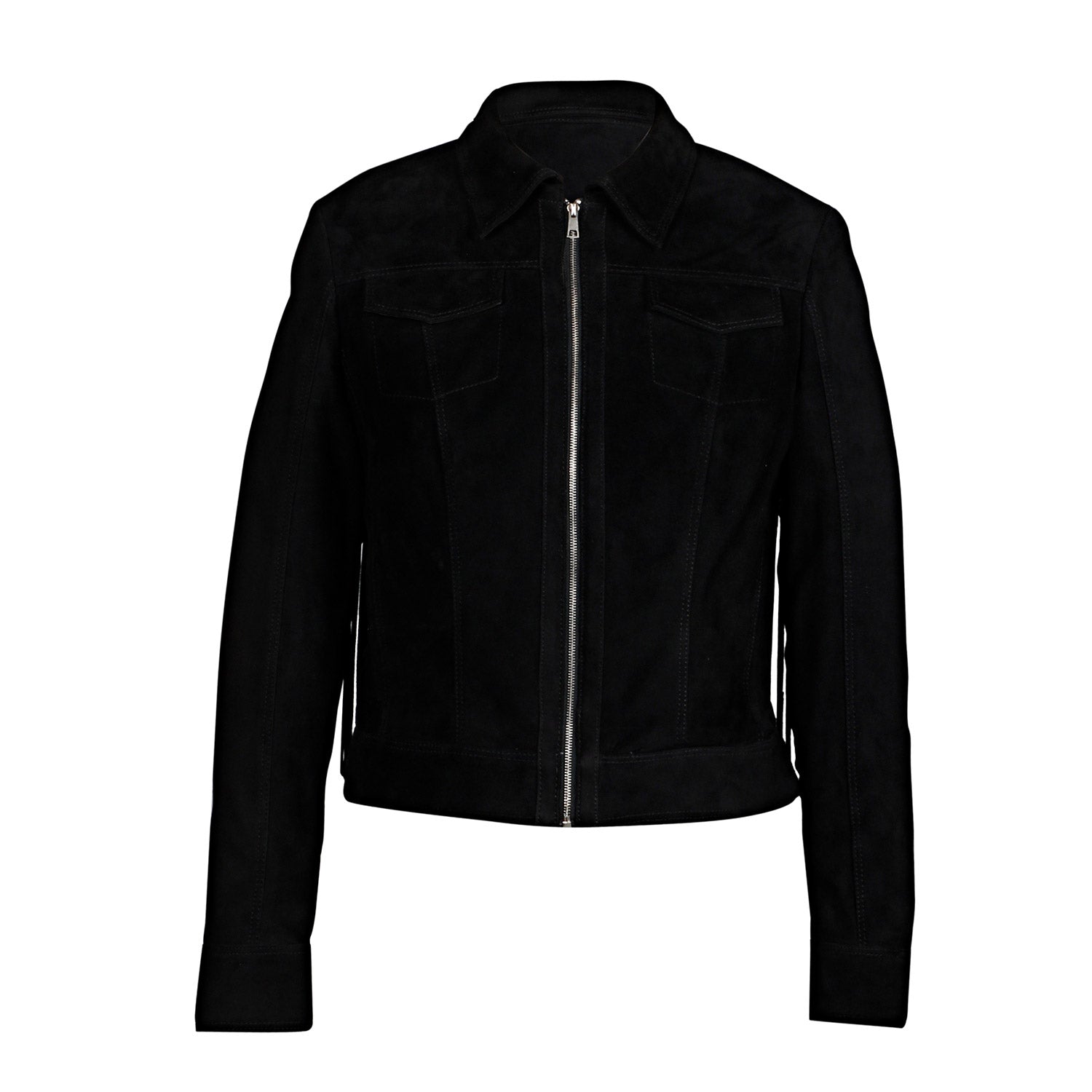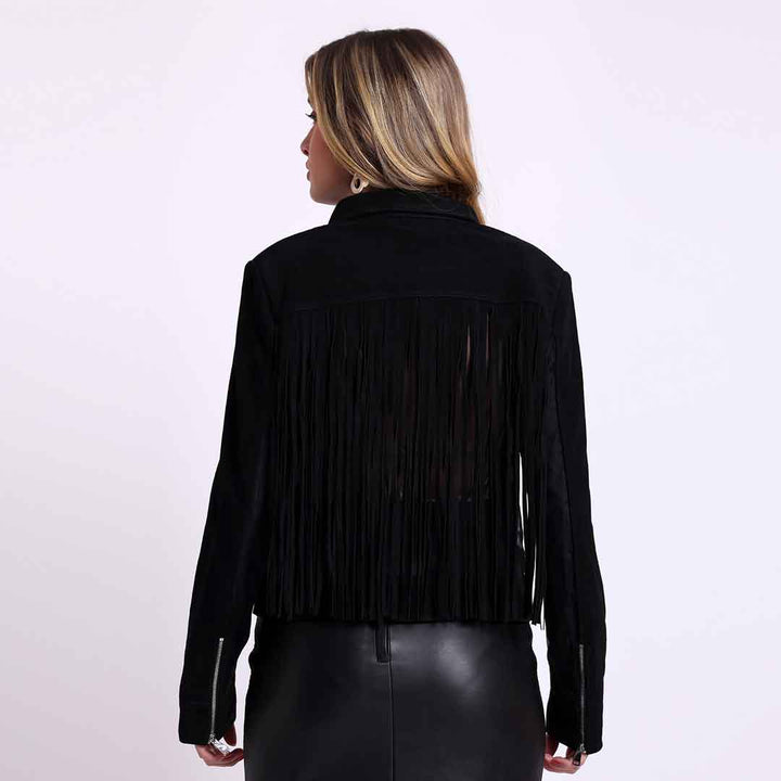 Keep cozy and comfy in this winter season's must-have outerwear - the Saint Melanie Fringe Jacket! Crafted of luxurious black suede leather with satin and taffeta lining, it features a spread collar, zipper closure, open hem zipped cuffs, and two outside pockets plus one inside pocket. Fun yet functional - you'll love the feel of this swanky style!