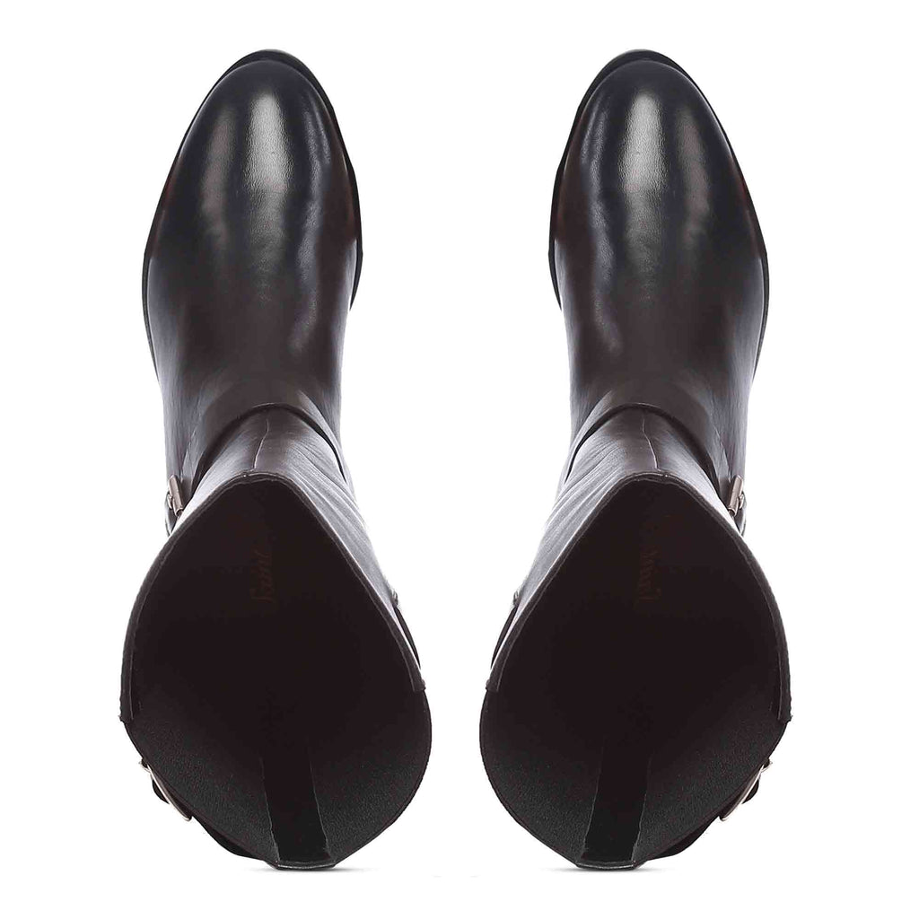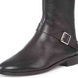 Get complimented for your rich sense of style by wearing this black leather knee high long boots from SaintG Luxe. Showcasing with gold color buckled wrap strap, soft and breathable leather lined for a luxurious feel, padded leather footbed provides lasting comfort. Featuring elasticated back panel for the perfect fit around the calf, the pull on closure to ensure comfortably slip them on and off. These great-looking strappy boots feature a classic western style. It accented by an extra buckle strap at the top of the shaft. these premium quality leather boots are constructed using an anti skid handmade tunit sole. Finished with a rounded toe. The Height of the Boot is- 42.67 cm (16.8 Inches) approx.