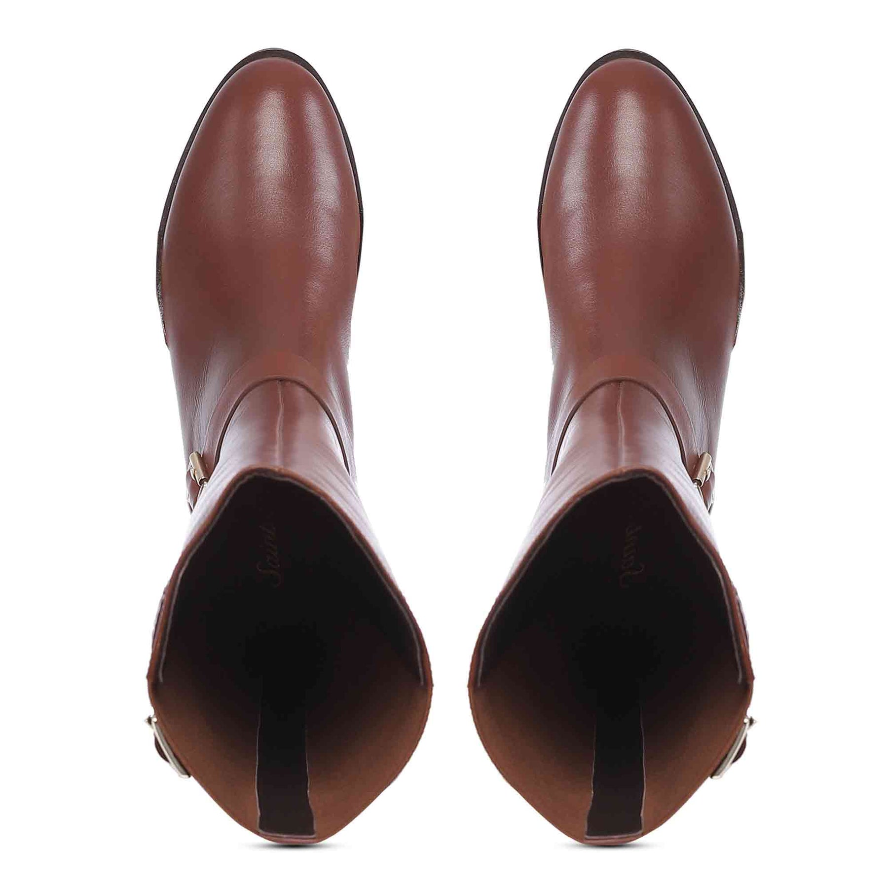 Get complimented for your rich sense of style by wearing this cuoio leather knee high long boots from SaintG Luxe. Showcasing with gold color buckled wrap strap, soft and breathable leather lined for a luxurious feel, padded leather footbed provides lasting comfort. Featuring elasticated back panel for the perfect fit around the calf, the pull on closure to ensure comfortably slip them on and off. These great-looking strappy boots feature a classic western style. It accented by an extra buckle strap at the top of the shaft. these premium quality leather boots are constructed using an anti skid handmade tunit sole. Finished with a rounded toe. The Height of the Boot is- 42.67 cm (16.8 Inches) approx.