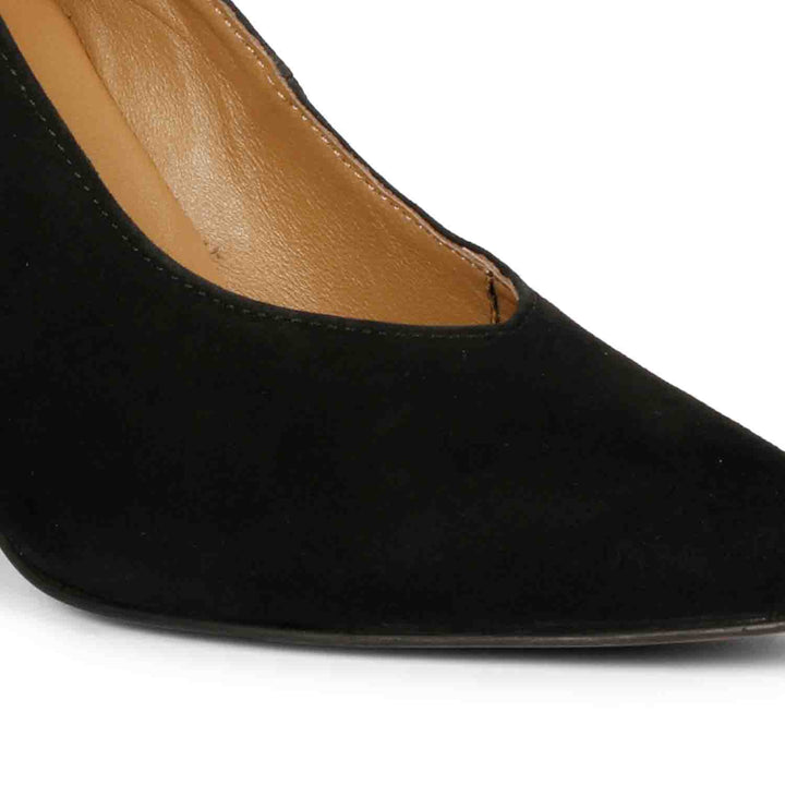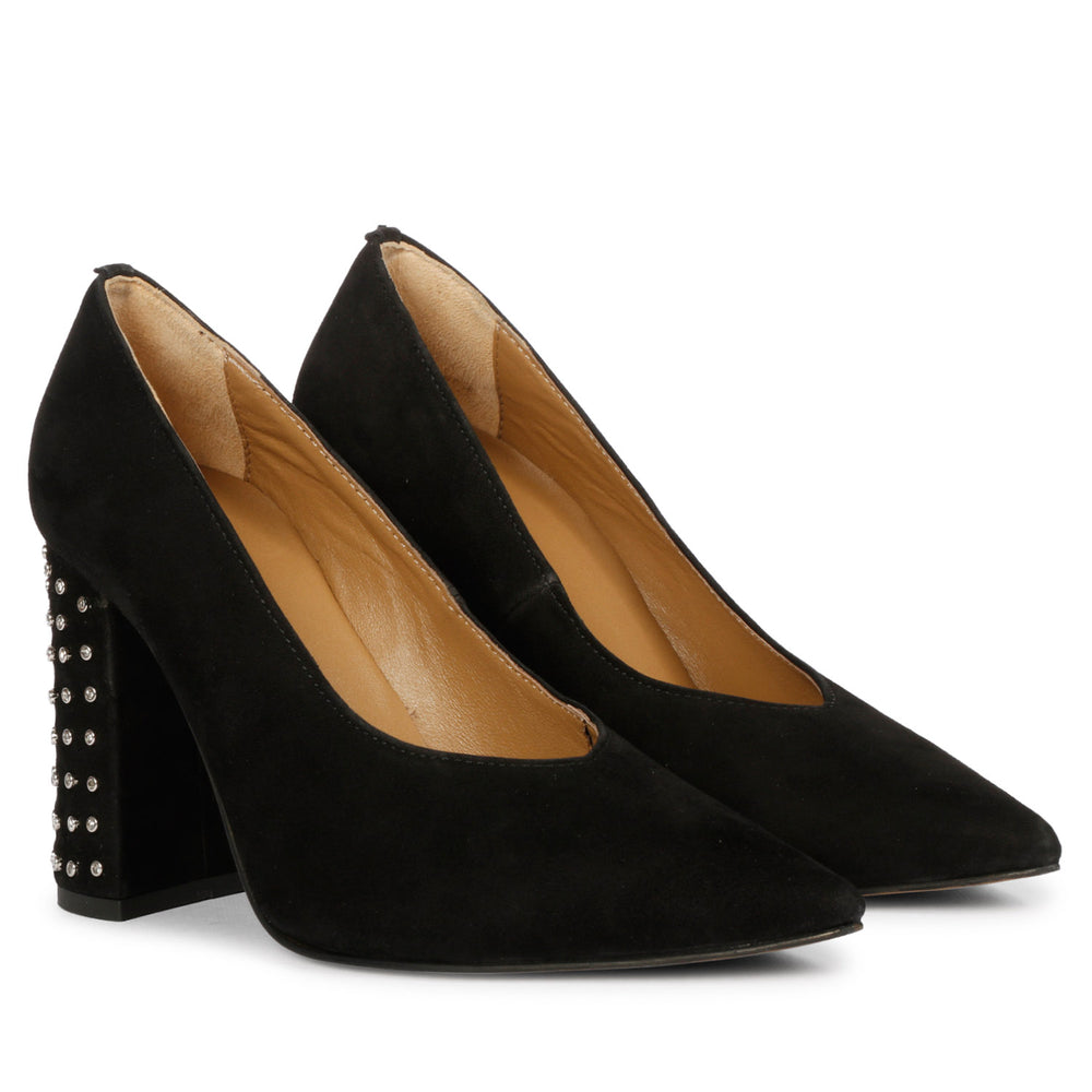 Saint Destiny's black suede leather pumps are the perfect addition to your wardrobe. Embellished with crystal studs, these pumps offer a unique style without compromising comfort. Crafted with quality suede leather, they provide reliable support and stability. Look great and feel confident wearing these luxurious pumps.