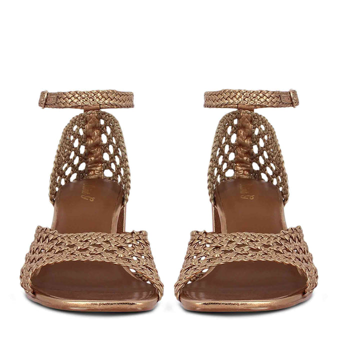 Sparkle and shine in this Eibhlin heel from SaintG. This metallic hand woven leather heel is an absolute must-have for your summer. Crafted from woven leather upper, padded leather insole, woven ankle strap and fitted on leather covered block heel.