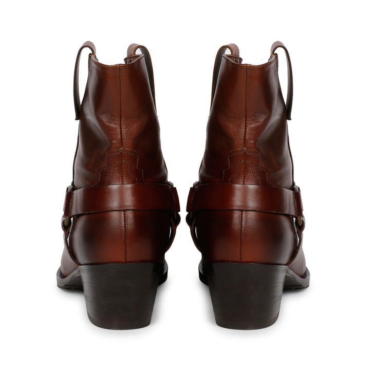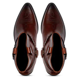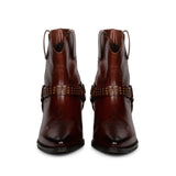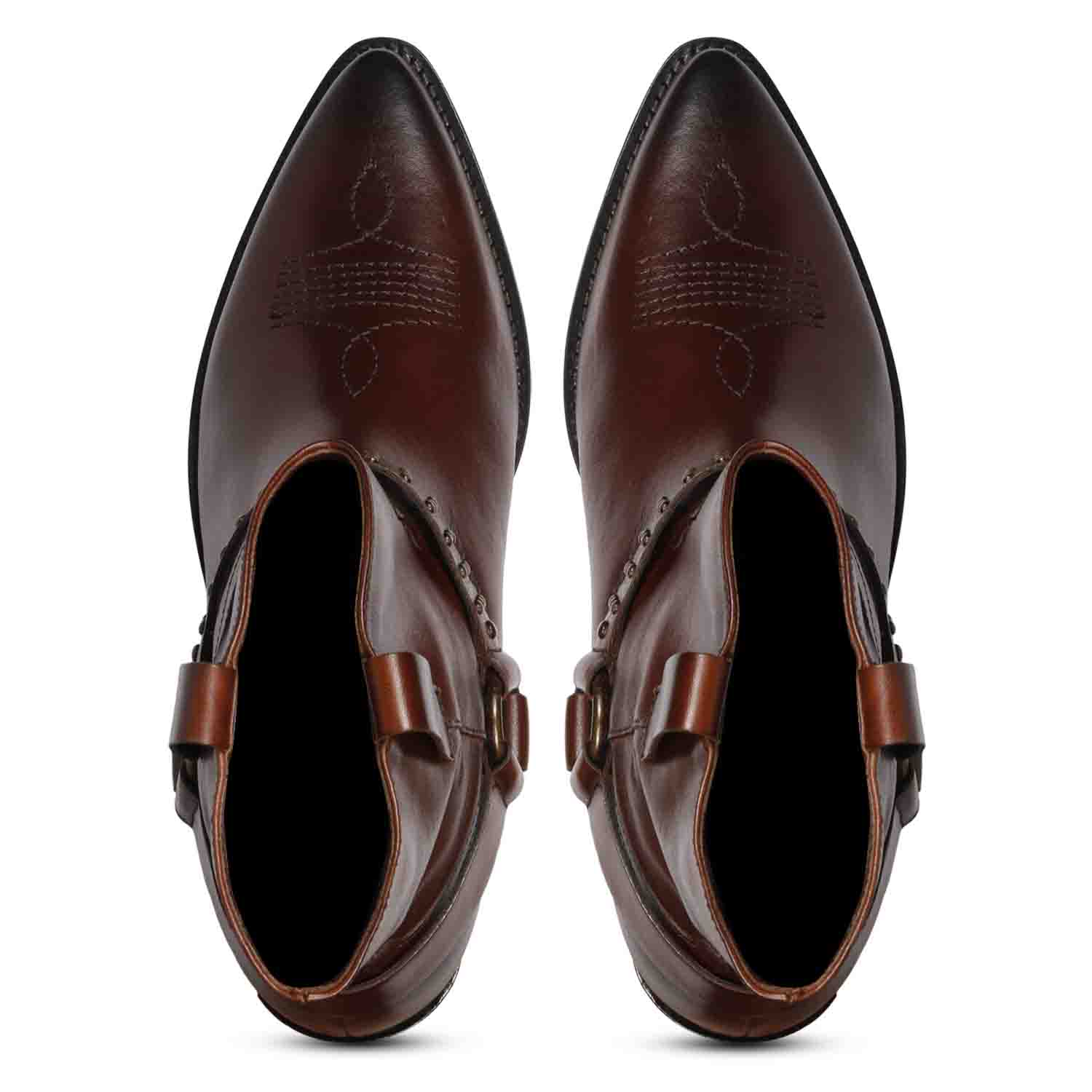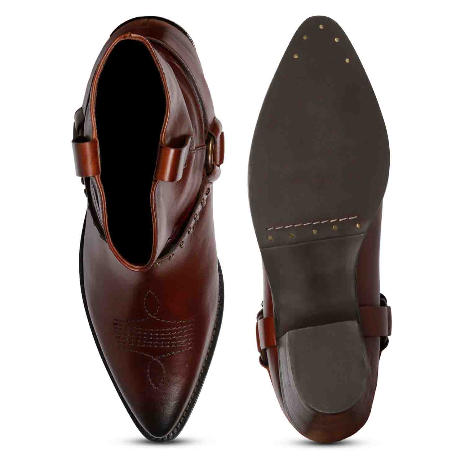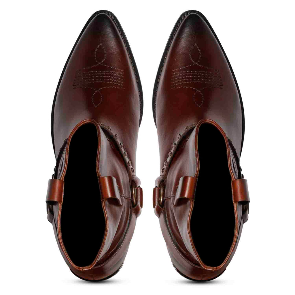 This teak color leather handcrafted ankle boot features a Stitched vamp, pointy toe, , metal studded strap with metallic silver O-ring, both side leather pull tabs for easy on/off, and low, stacked heel for all-day walkable comfort.