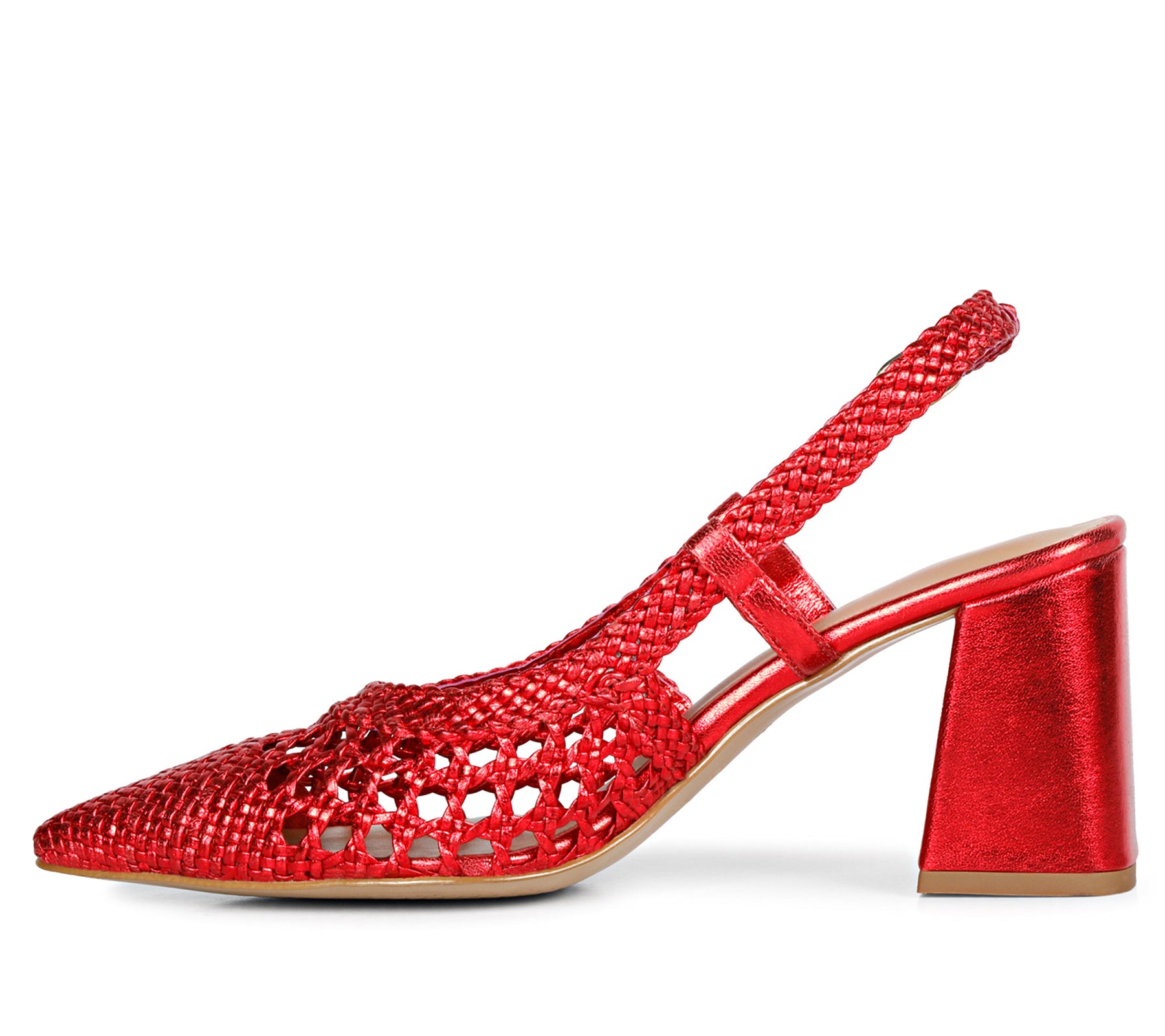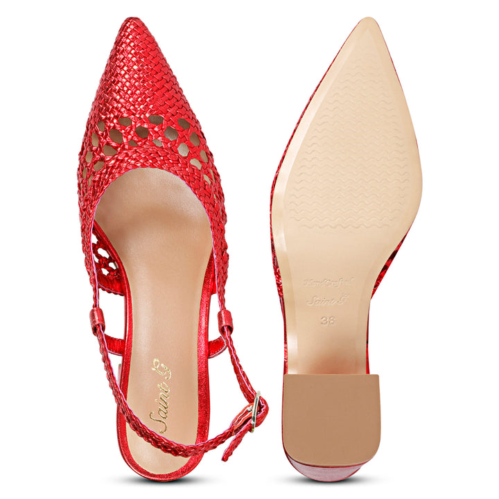 Sparkle and shine in this Fabienne woven block heel from SaintG. This red metallic hand woven leather heel is an absolute must-have for your summer. Crafted from woven leather upper, padded leather insole, woven buckle strap and fitted on leather covered block heel. The pointed toe and mid height block heel make these truly timeless.