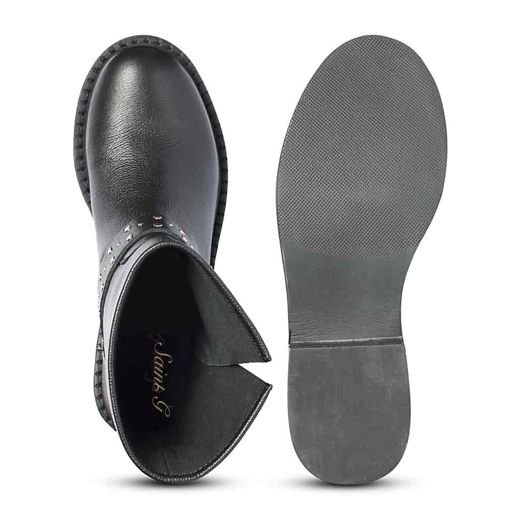 Industrial spirit meets sartorial finesse — these biker-chic mid-calf boots exude commanding edge with artisanal grained leather, a studded harness strap, and a solid block sole ready for the pavement runway.