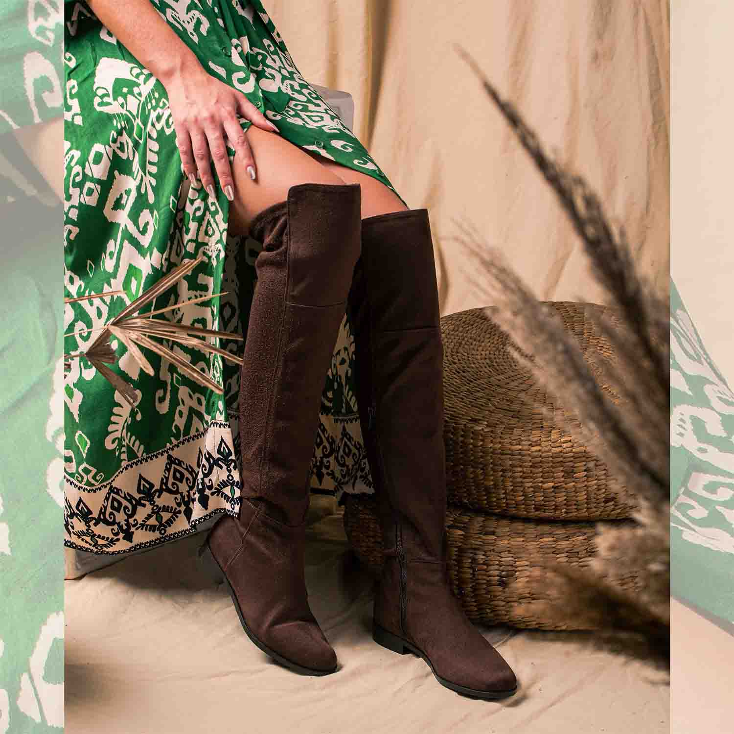 Complete your edgy style with these brown stretch suede above the knee riding boots. Featured thigh high, stitching details, paneled finish with a round toe and low heel. inside zipper closure for easy on/off. Finished with leather insole and leather lining.