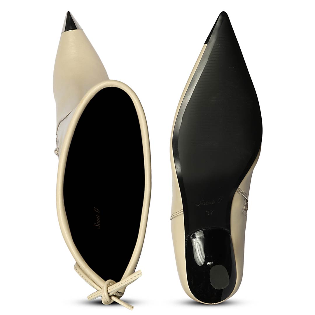 A metal toe cap adds a striking contrast at the front- giving the pointed toe a bold, modern finish- while the slim mid-height heel shapes a graceful, confident stance. The inside zipper closure allows easy wear and a secure fit without disturbing the boot’s streamlined look.