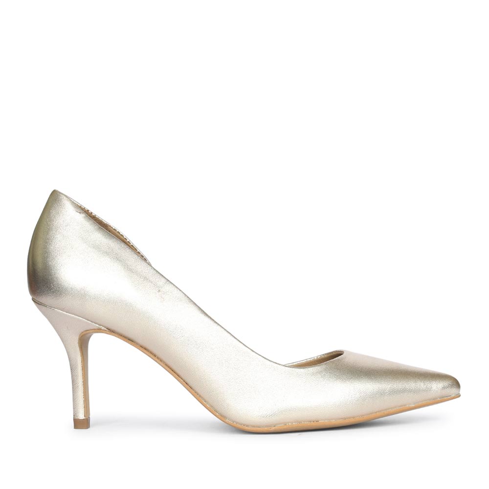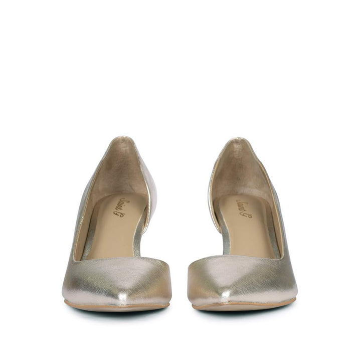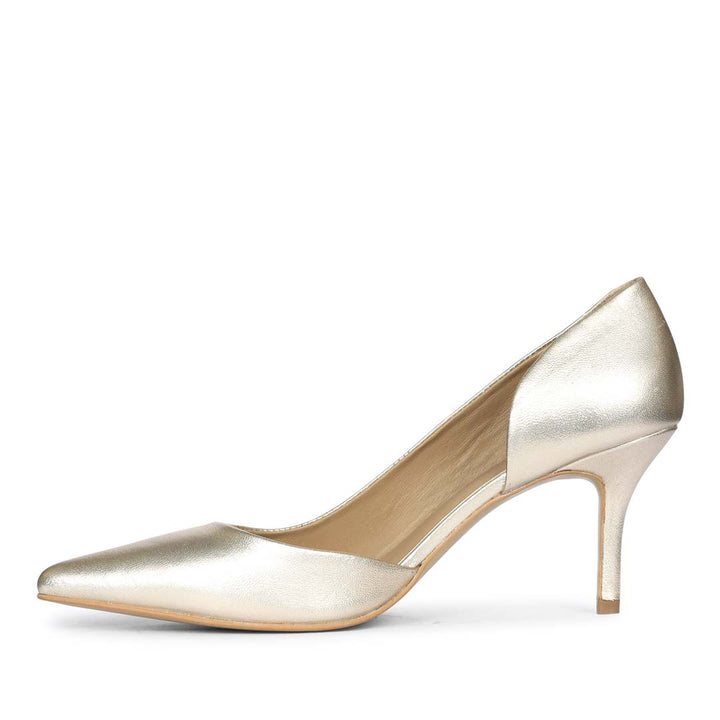 Slip into this radiant pair- delicately pointed, softly padded, and dipped in gold. From the metallic leather to the understated shine and poised silhouette, every detail is designed to enchant. The kind of heel that turns heads without even trying.