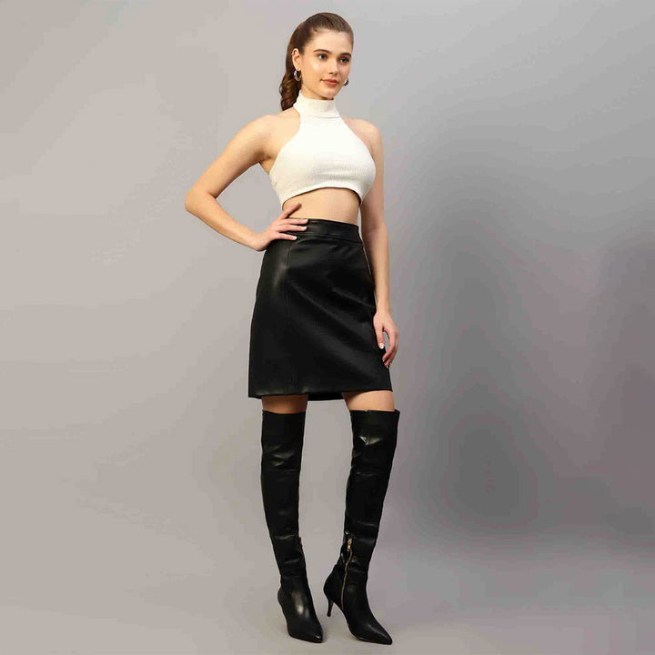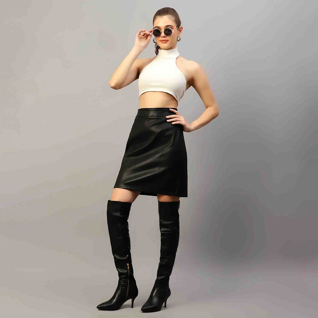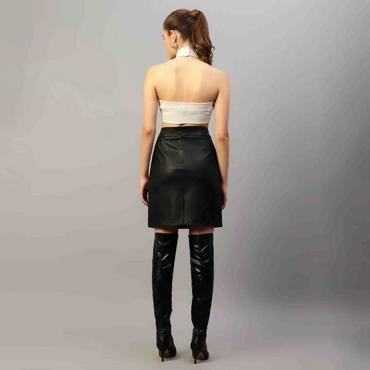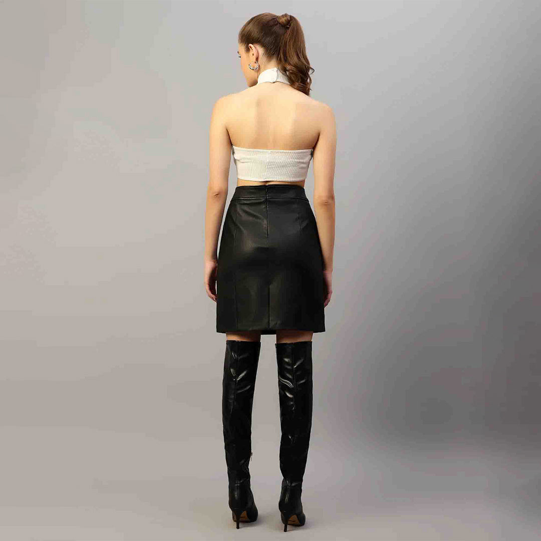 This stylish Saint Letitia black stretch leather skirt is designed to flatter any figure. Crafted from Genuine crust leather, the skirt features a concealed zip closure for a snug fit. Perfect for the office or a night out.