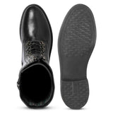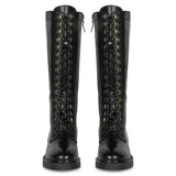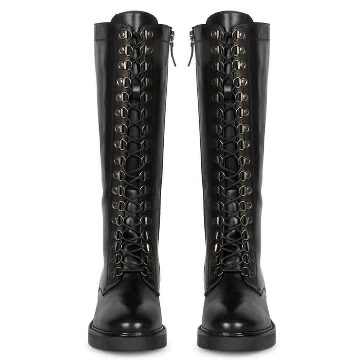 Meet Saint Mercello black leather handcrafted long boots, the new classic. These boots are sure to turn heads. Featuring high tongue lace-up front and red welted low block heels. fleece and soft leather lining for a luxurious feel, padded leather insole provides lasting comfort. The inside zip closure boot sit on a TPR sole. Designed in Milan.