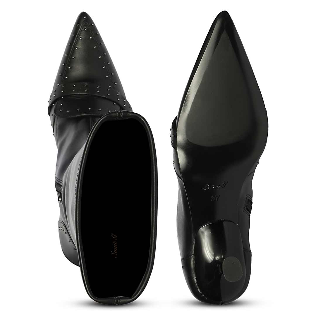 The Saint Maribel Studded Stretch Knee-High Boots bring a bold edge to your wardrobe with a sleek mix of stretch napa along the shaft and smooth leather construction below the ankle. The pointed toe is accented with fine metal studs, paired with a sculpted mid-heel that adds poised height. A pull-on profile with a rear loop ensures an easy fit, while the leather footbed offers a grounded feel. Designed to stand out, this pair seamlessly complements dressy edits, winter layers, and evening looks.