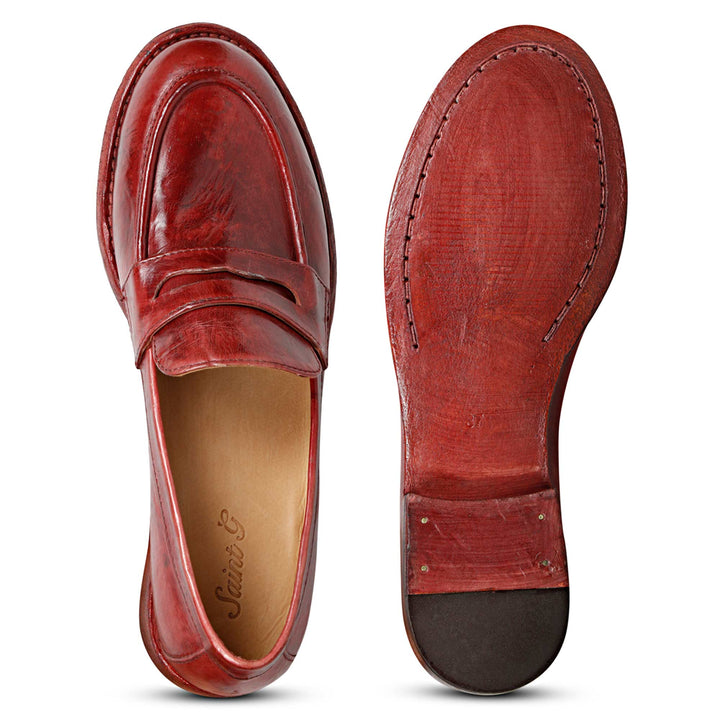 Comfy and trendy, this casual moccasin from SaintG will quickly become your favorite kicks, features a Red leather upper, veneer leather covered low heel, a saddle strap embellishment across the vamp and a slip-on design. Complete with breathable leather lining, padded leather insole and leather sole. These can be stylishly worn outdoors and indoors. Finished with stitching accents, has a slip on closure.