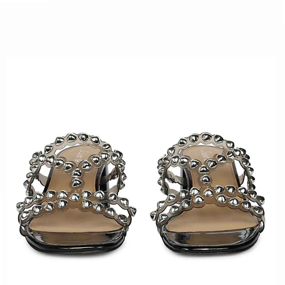 Meet Opal, a bold yet playful statement heel designed to add a touch of charm to every step. Crafted with smoke transparent straps adorned with silver metal studs embellishments, this open-toe silhouette brings a modern romantic edge to classic evening footwear.