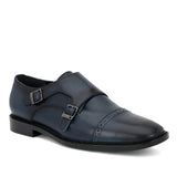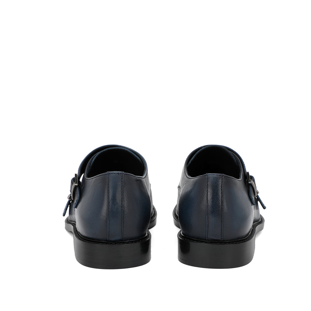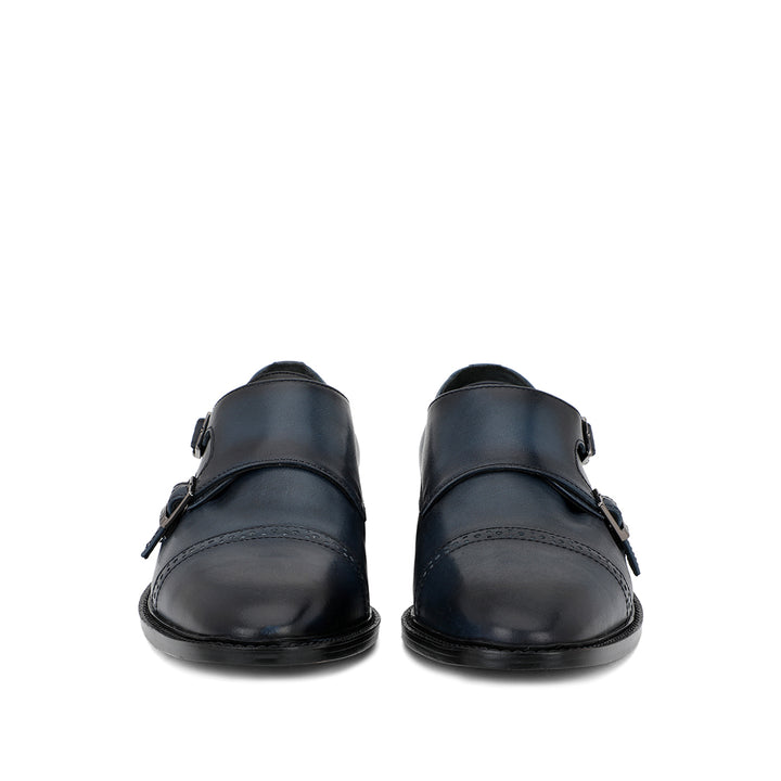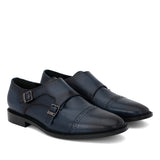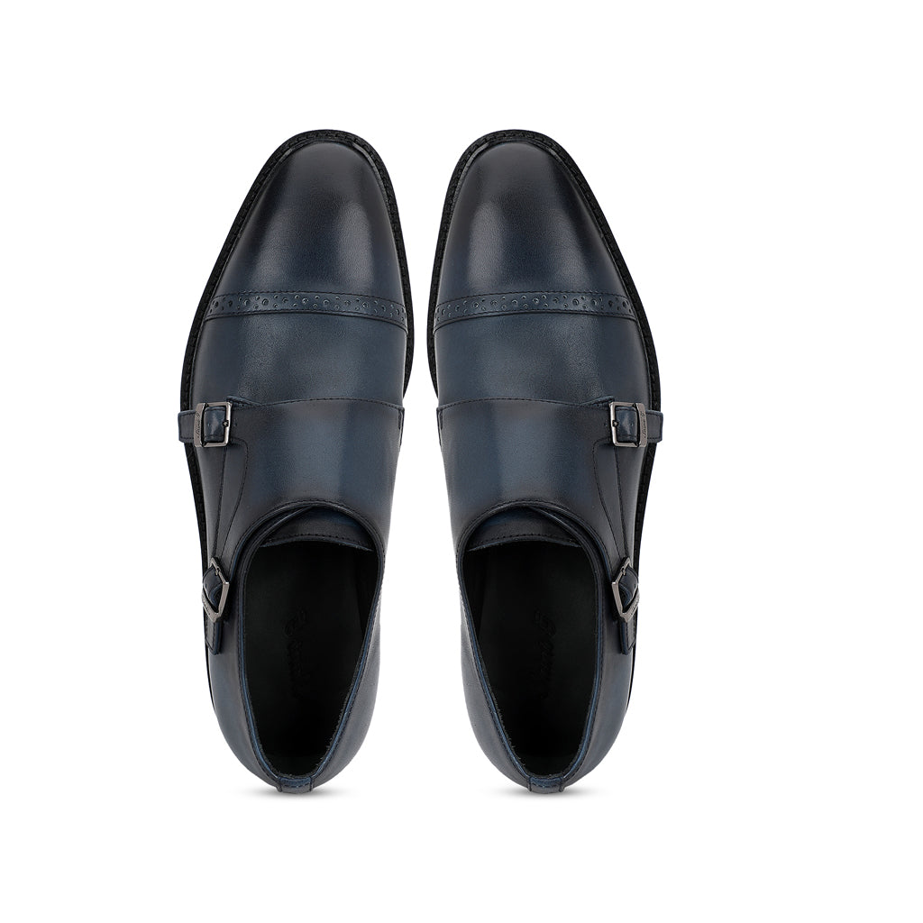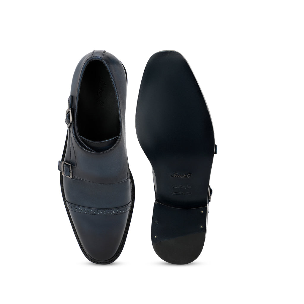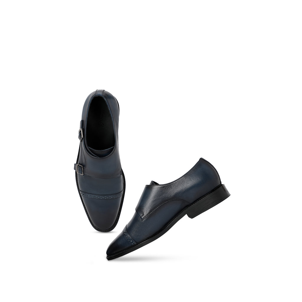 A pair of handcrafted blue leather double buckled monk strap brogues. Its complete with soft leather lining and padded leather insole for comfort. has a anti skid tunit sole for class and durability, has a 6mm welt.