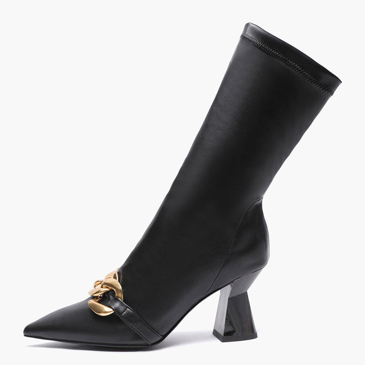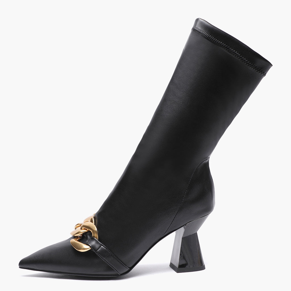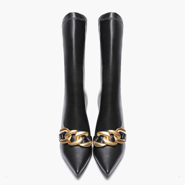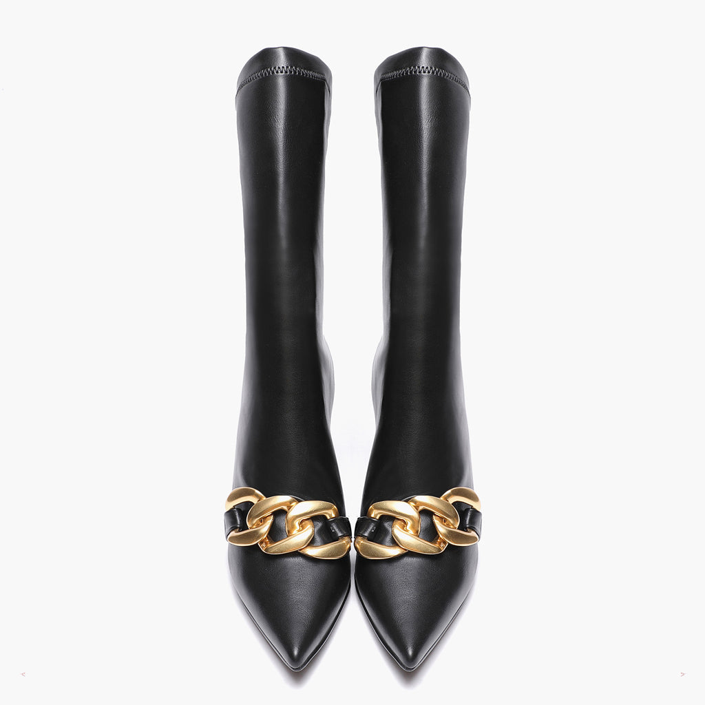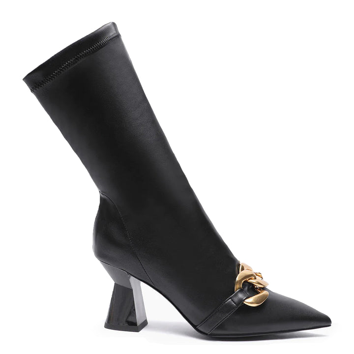 Add these Rosalie black stretch slouch boot to your wardrobe for an easy way to rock an edgier look! Crafted in stretch napa, leather lining and branded leather insole, these slouchy calf boots have a pointed toe and are embellished with an opulent gold-tone hardware chain-link detail at the front. The slip on boot sit on a sculptural heel.