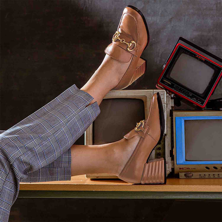 Kick your personal style up a notch with a pair of beautiful moccasins from SaintG, a timeless distressed leather handcrafted shoe that'll definitely add some class to your outfits. Distressed leather is like hand crafted effect to make it look like worn out leather, also similar to vintage leather. This shoe features a leather upper, a decorative leather covered mid block heel, embellished with a gold Horsebit detail on the front and a slip-on design. complete with breathable leather lining, a padded leather insole and leather sole. These can be stylishly worn outdoors and indoors.