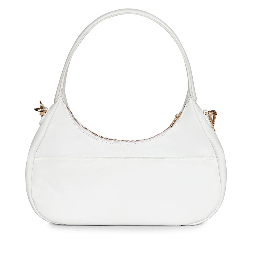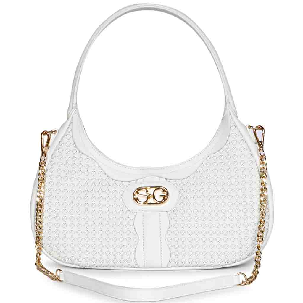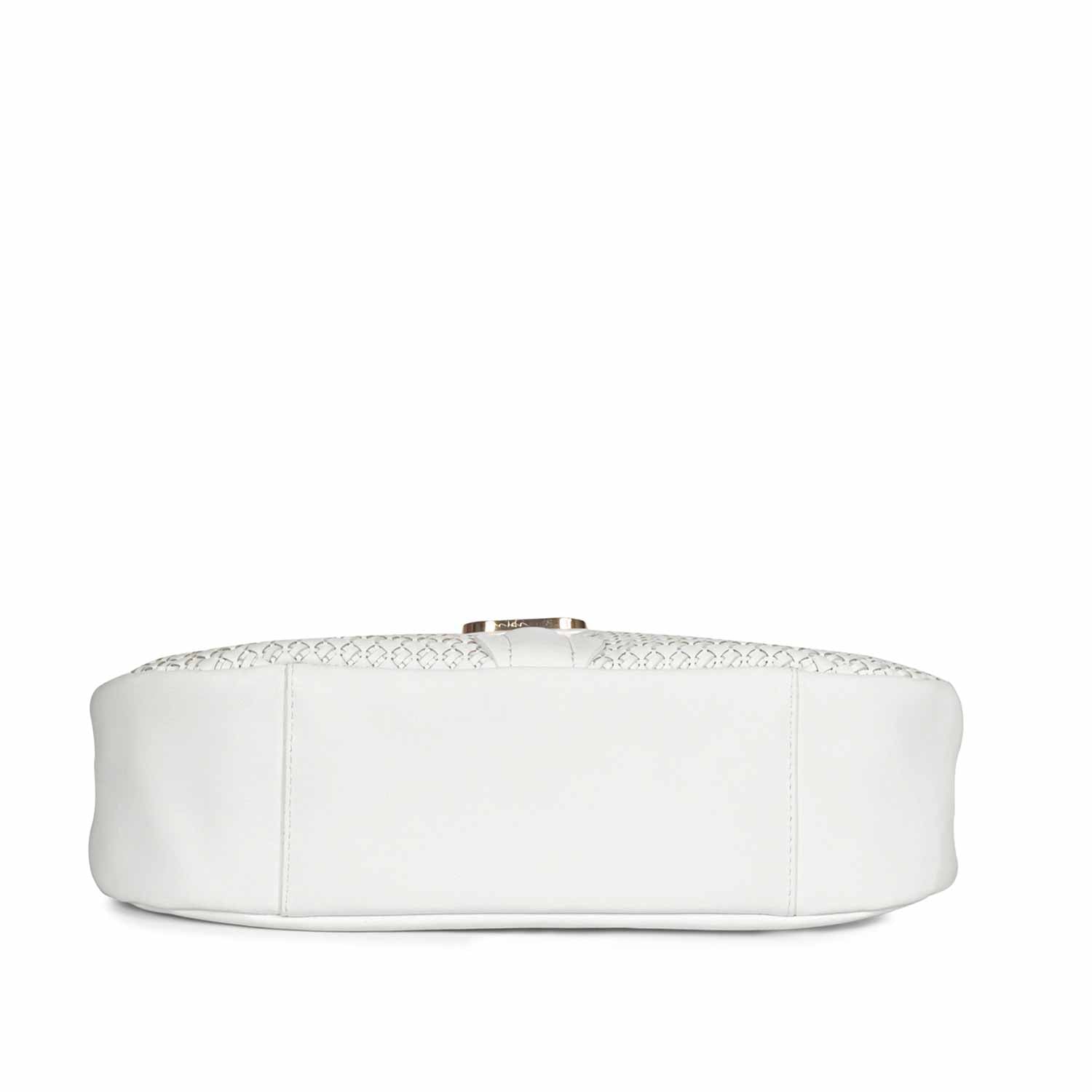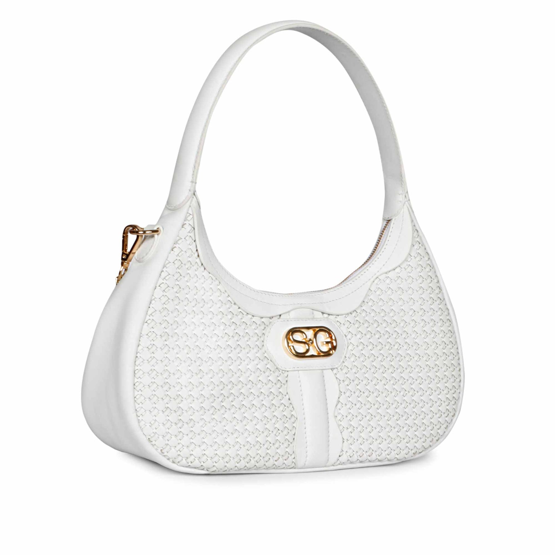 Tesorina is a gorgeous white leather hobo style shoulder bag with an incredible hand-woven front panel. Spacious for all your daily needs, it has a padded leather handle and a detachable gold toned metal chain sling strap, zipper top closure and cotton lining with one slip pocket and an exterior backside pocket with magnetic button closure to keep you organized. Grace all your outfits with this visually stunning addition you need this season.